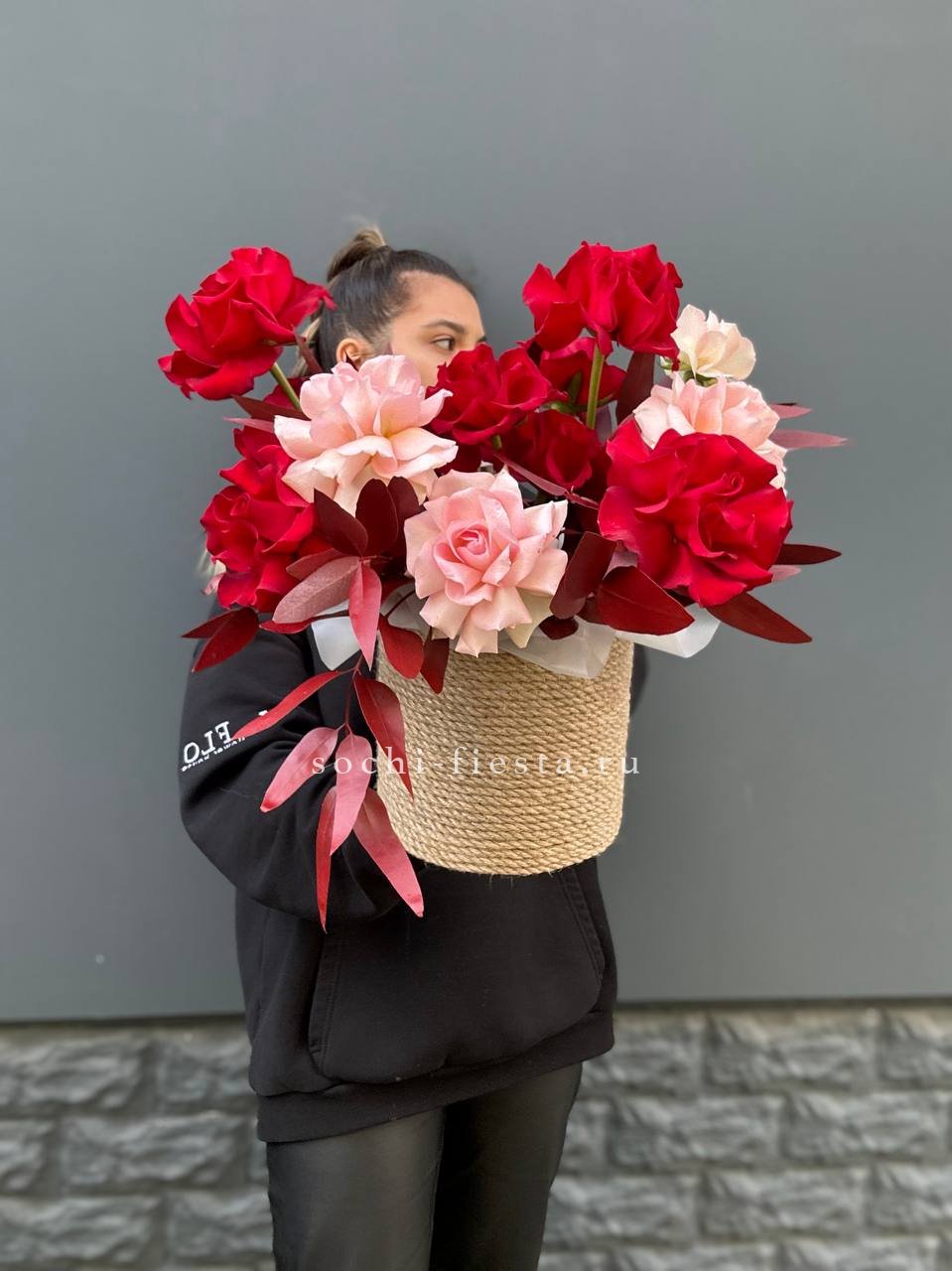 вывернутые кеннийские розы, джутовое кашпо, эвкалипт, лента, упаковка.