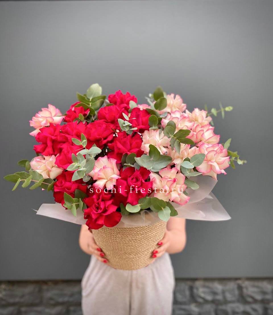 вывернутые французские розы, джутовое кашпо.