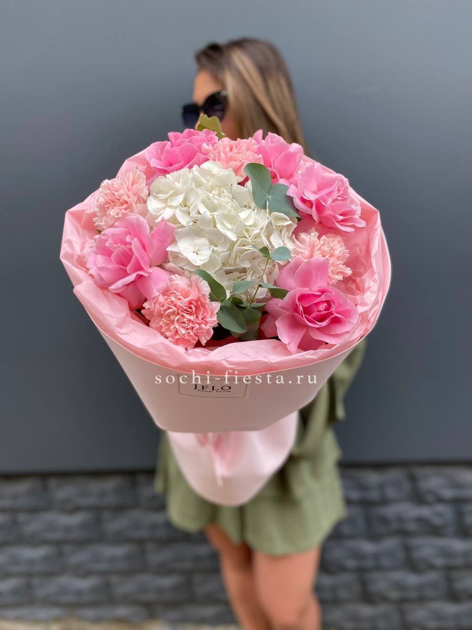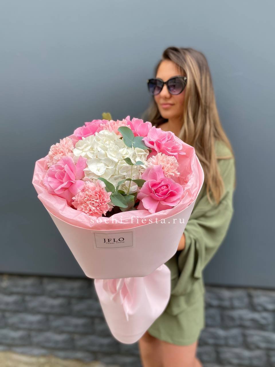 Пятьдесят один бутон в мягкой бело-розовой гамме создает объемную форму с живым ритмом. Микс оттенков добавляет воздушности и естественной динамики композиции.