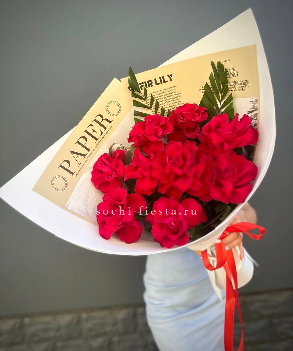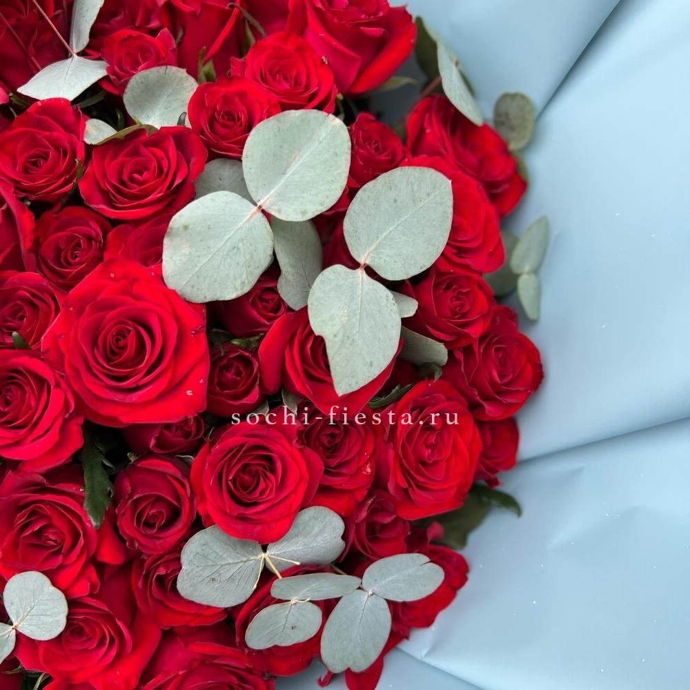 Пятьдесят пять бутонов собраны в плотную округлую форму, где каждый цветок читается отдельно. Красный здесь звучит насыщенно и глубоко, создавая мощное визуальное присутствие. Букет держит форму и занимает пространство уверенно.