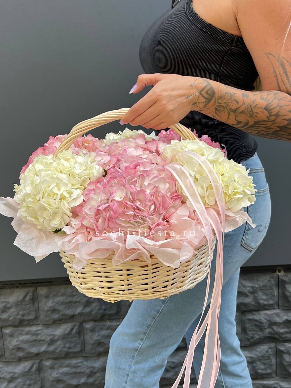 гортензия - 7 шт., лента, корзина.