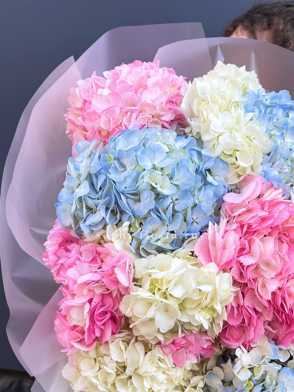Корзина в лавандовых тонах объединяет пышные соцветия гортензии, кустовые и классические розы с воздушным лимониумом. Эвкалипт добавляет графику и свежесть всей композиции.
