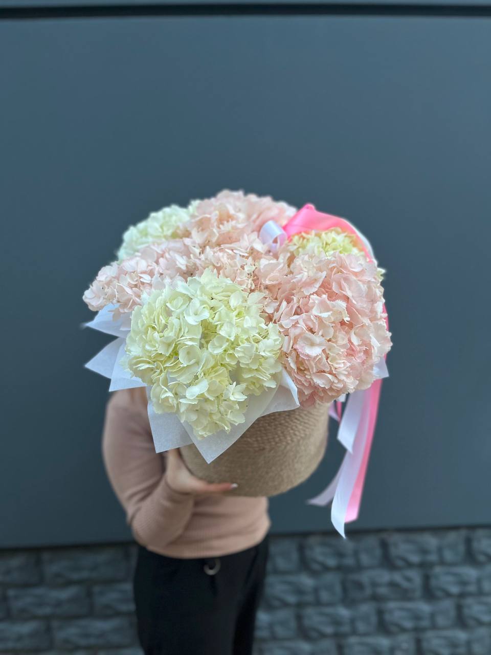 гортензия нежно-розовых оттенков, эустома, львиный зев или маттиола, розовые розы, эвкалипт, вспомогательная зелень, лента, светлая корзин.