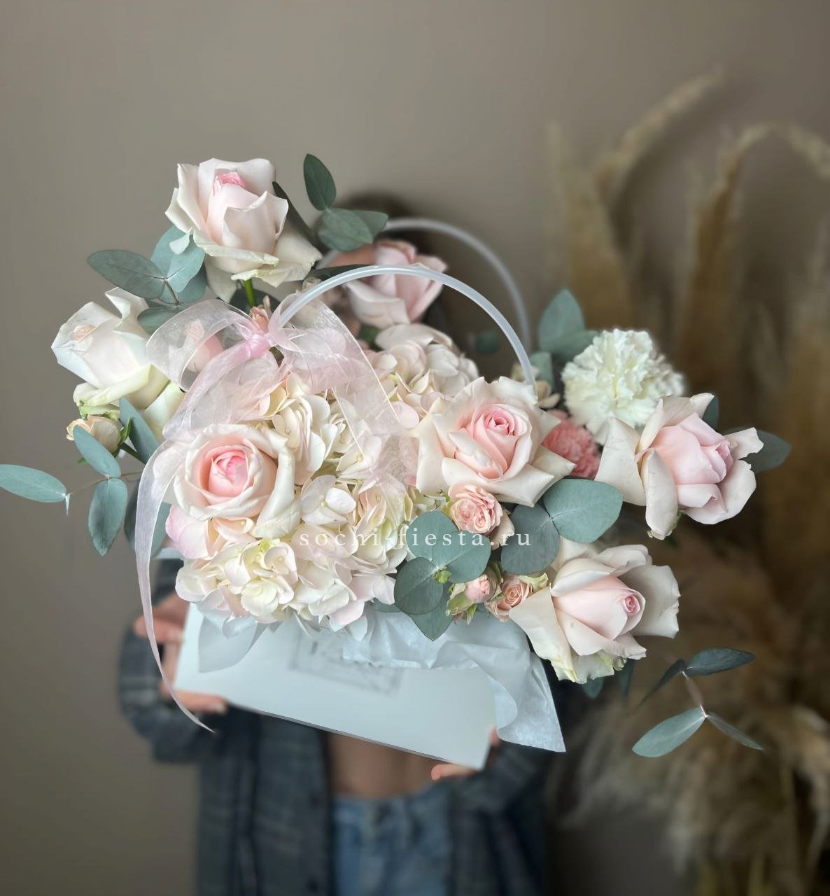 гортензия, розовые розы, пионовидные розы, диантус, эвкалипт, лента, сумка-кашпо.
