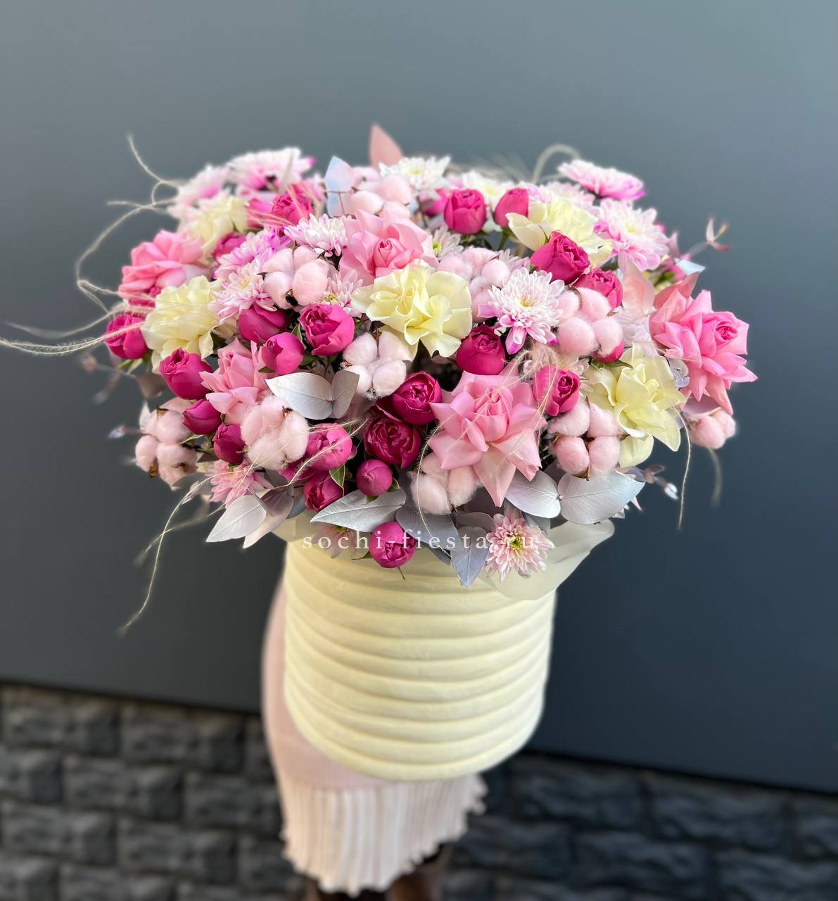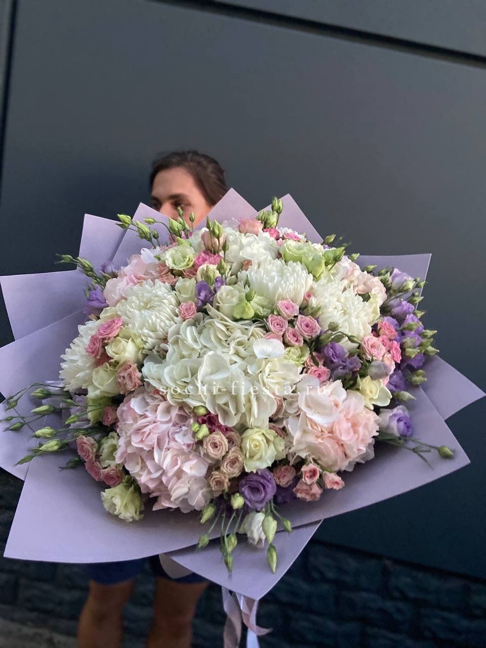 Пышная композиция с насыщенным цветением и многослойной глубиной. Пионовидные формы переплетаются с воздушной эустомой, создавая объём и плавный переход от центра к краям. Каждый бутон раскрыт по-своему.