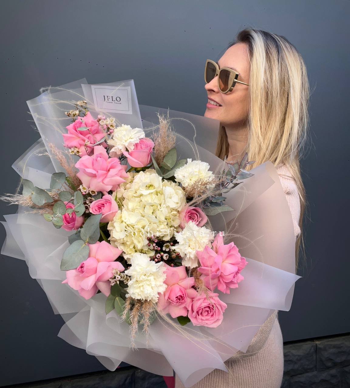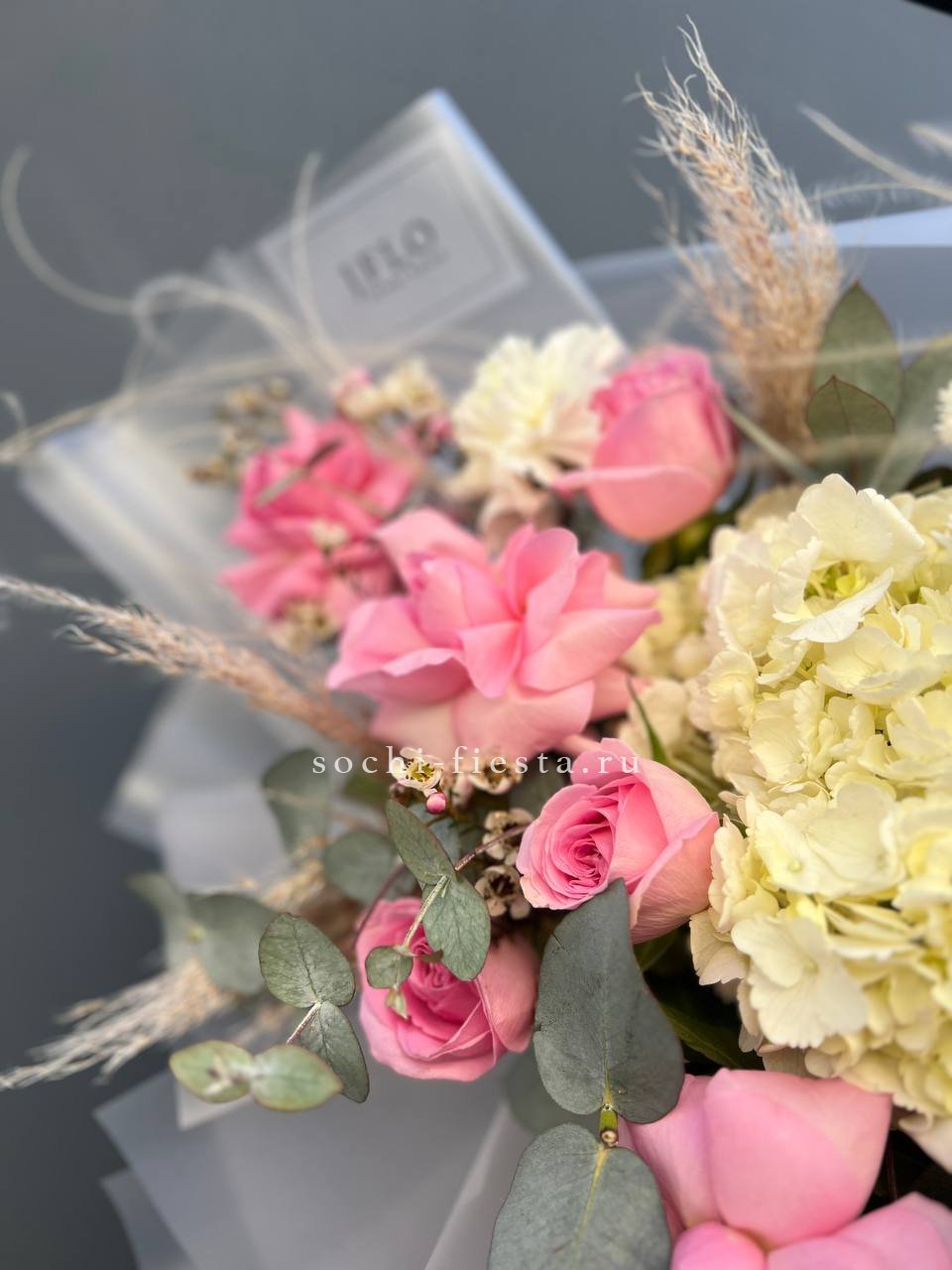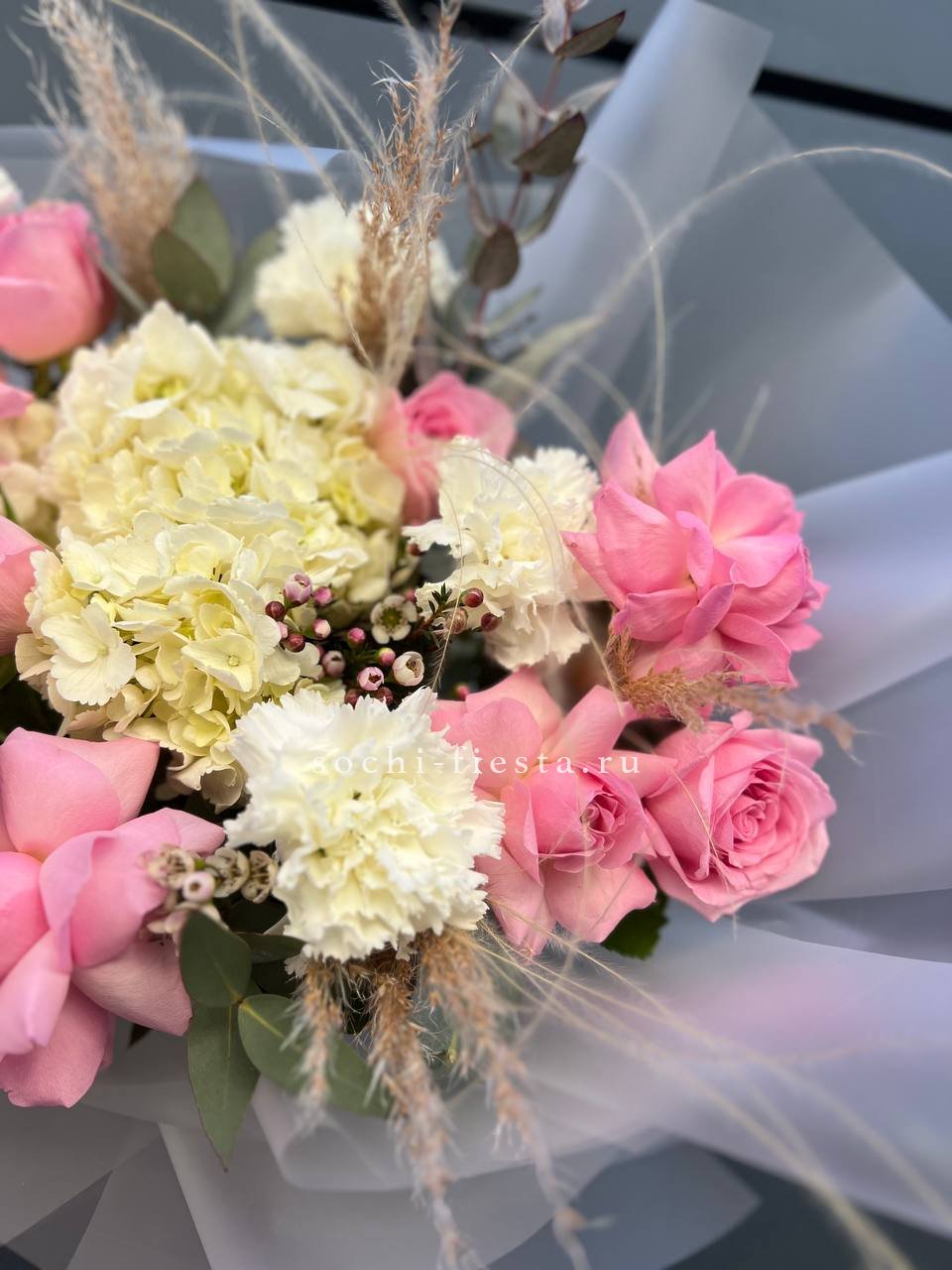 Пышная гортензия задаёт объём, а розы и диантусы наполняют композицию мягкими переходами оттенков. Эвкалипт добавляет воздушности, не перегружая форму. Букет собран так, чтобы каждый цветок читался отдельно, но работал на общую картину.