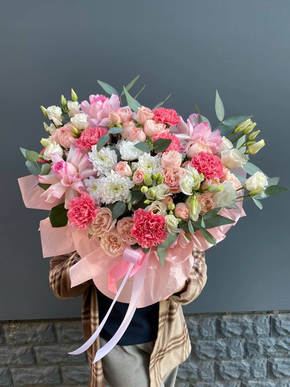 Пышная композиция в круглом боксе объединяет розы, эустому, хризантемы и диантус в плотную цветущую массу. Бомбастик добавляет объёма, а эвкалипт смягчает переходы между соцветиями. Готовое решение для размещения на столе или комоде.