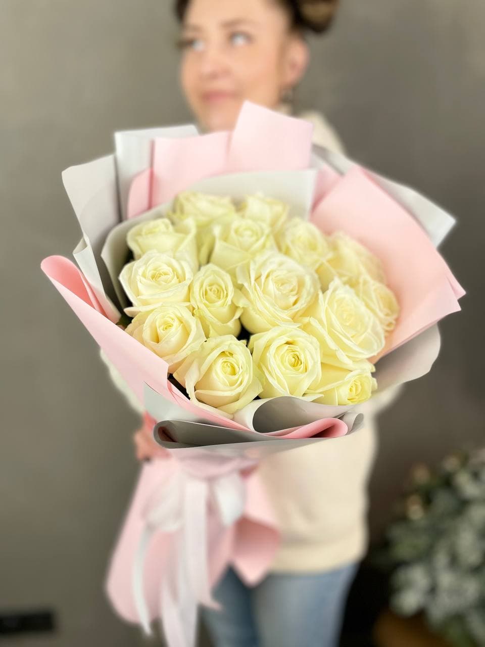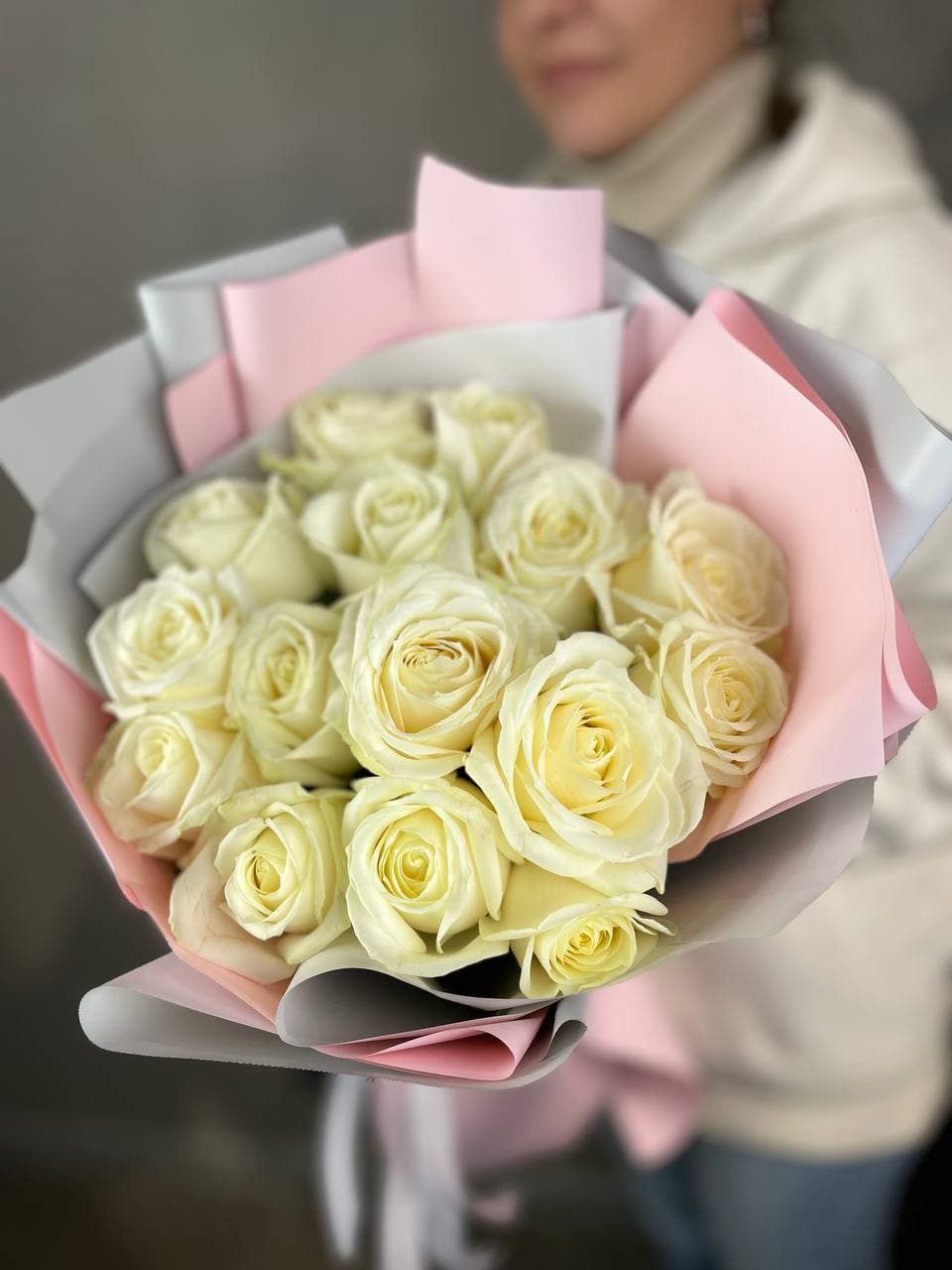 Пятнадцать белых роз в дизайнерской бумаге создают мягкий графичный силуэт. Бутоны собраны плотно с сохранением естественного ритма и воздуха между ними.