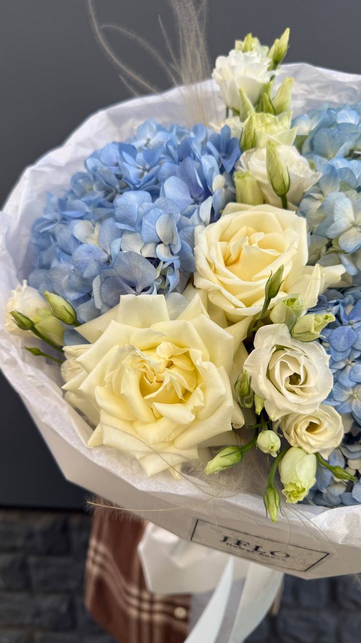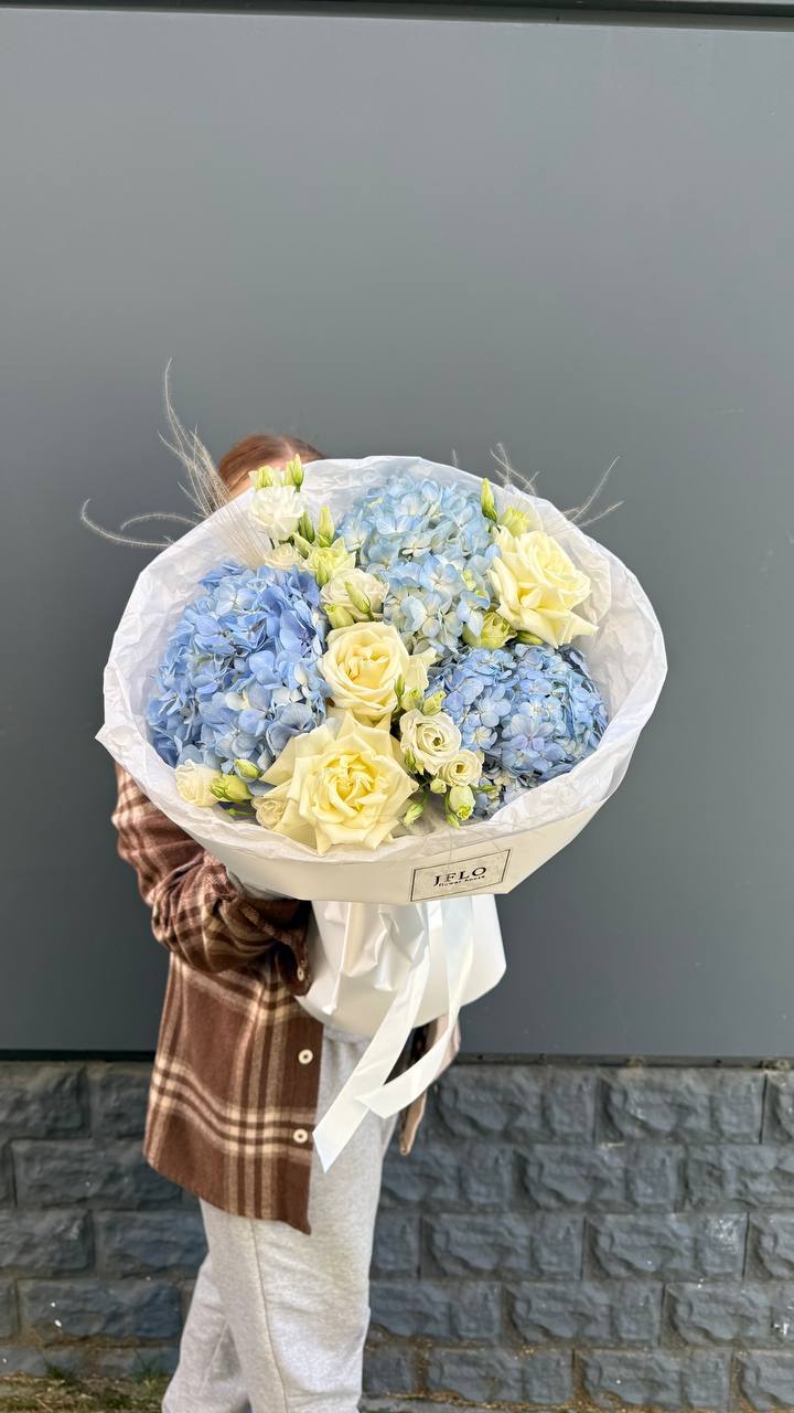 Сочетание пышной голубой гортензии и классических белых роз — это гимн нежности и чистоты. Букет, который не просто удивляет своим масштабом, но и дарит ощущение безмятежности. Идеальный выбор для самого искреннего признания.