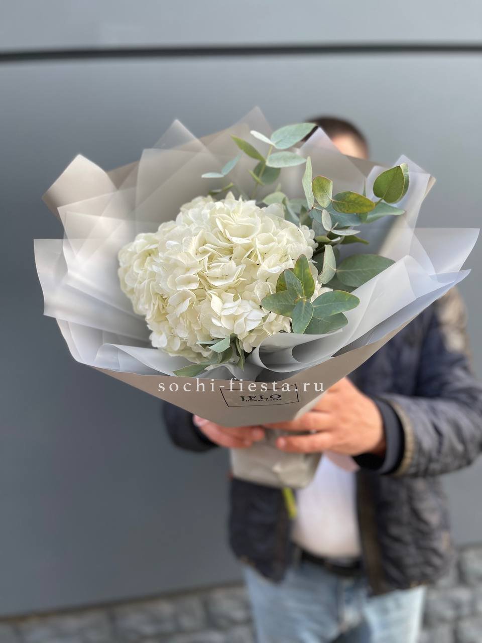 Пышные бутоны Сара Бернар раскрываются среди лепестков роз и воздушной гортензии. Эустома добавляет графичности, а эвкалипт собирает композицию в единый силуэт. Цветовая гамма плавно перетекает от розового к голубому.