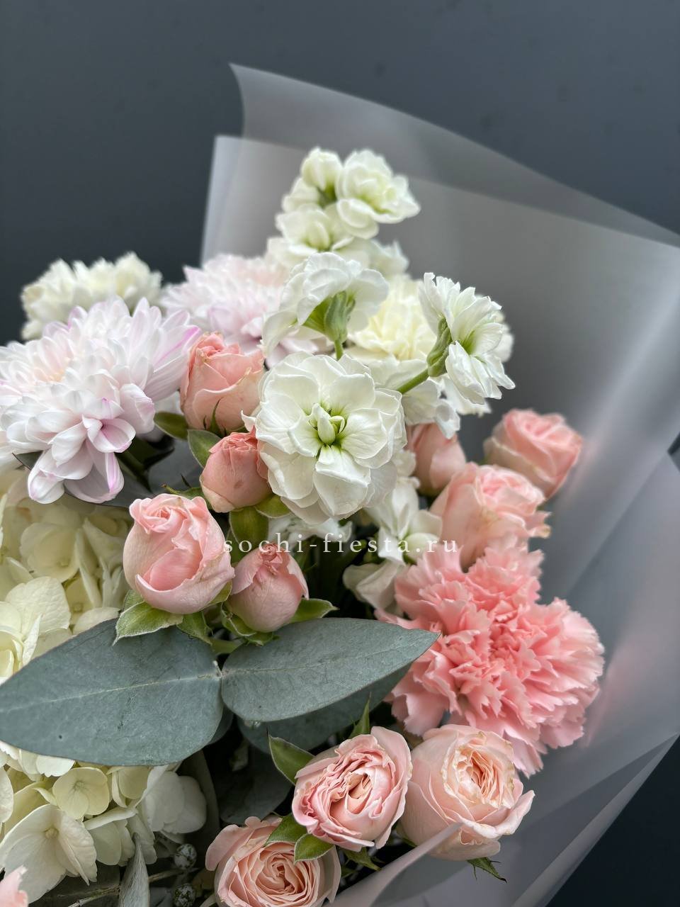 гортензия, диантусы, маттиола или замена в несезон, бомбастик, хризантема в воздушном оформлении.