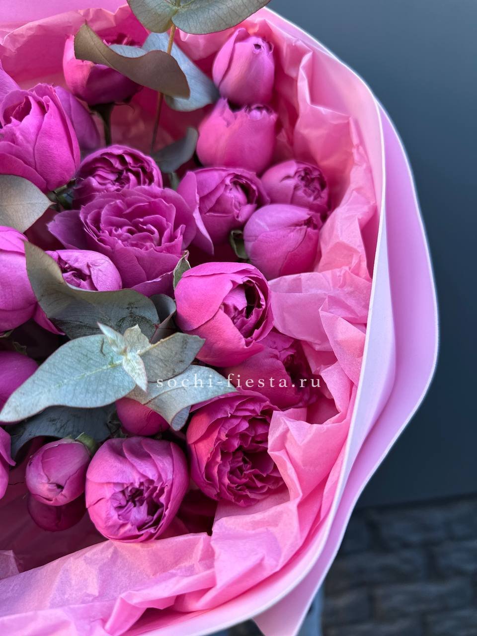 пионовидные розы, розовые розы, эвкалипт, лента, дизайнерская упаковка.