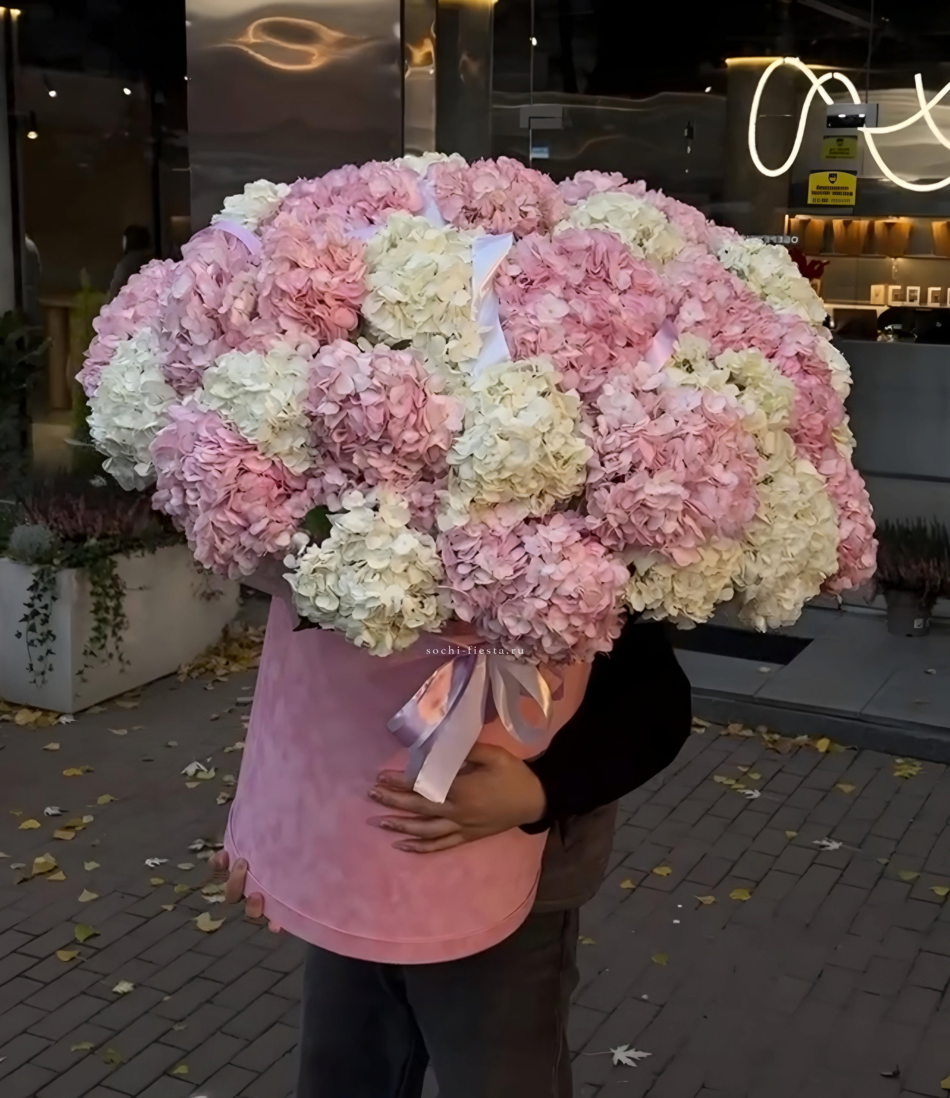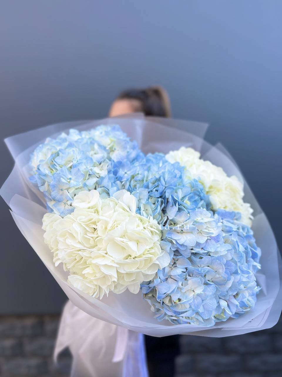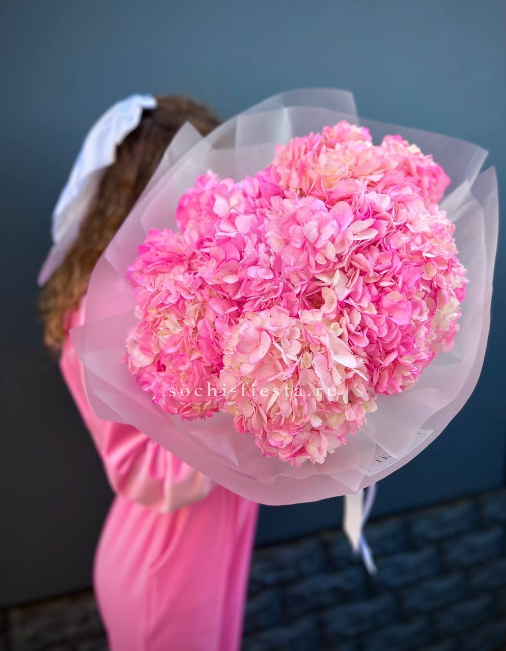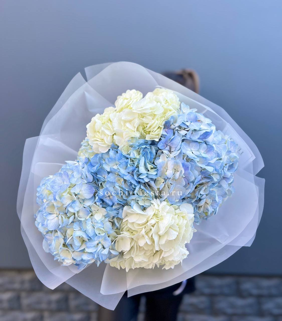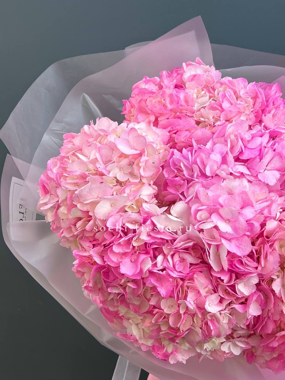 Двадцать пять соцветий гортензий разных оттенков формируют пышное облако с естественной игрой цвета. Каждая головка раскрывается по-своему, создавая живую фактуру без четких границ между тонами.