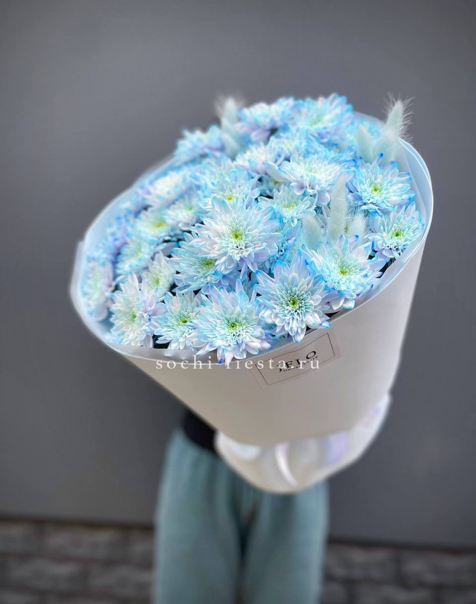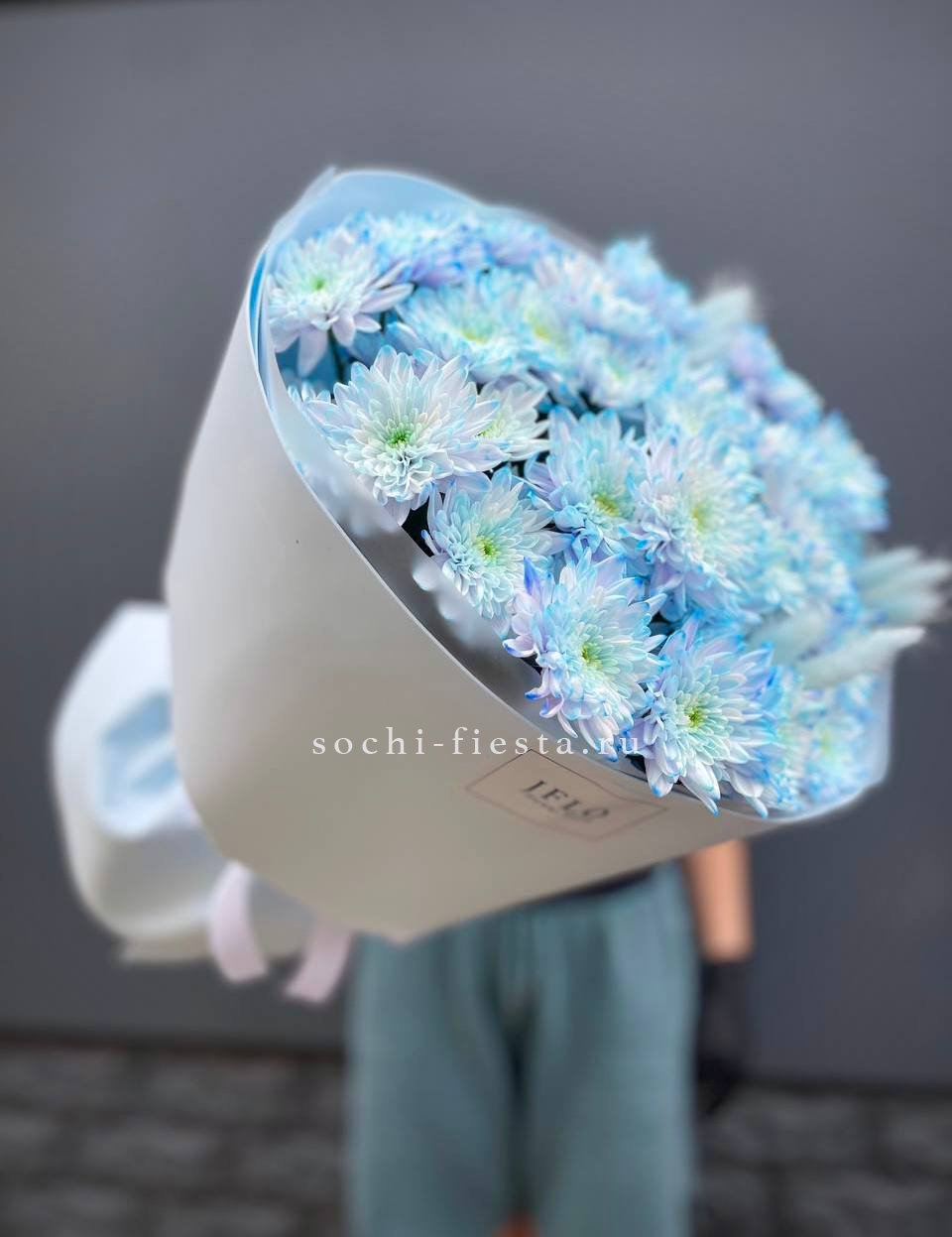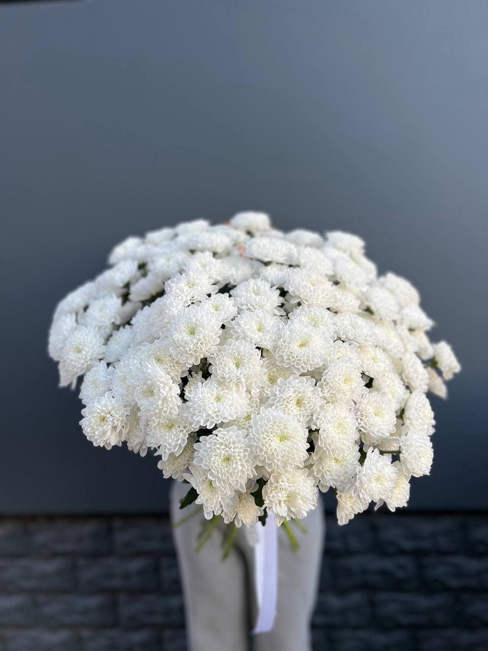 Пушистые коробочки хлопка добавляют воздушности между соцветиями хризантем. Природная фактура встречается с декоративной упаковкой в компактной форме. Букет держит объём и выглядит свежо несколько дней.