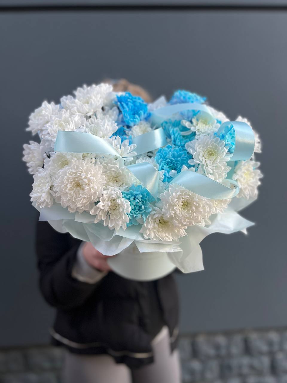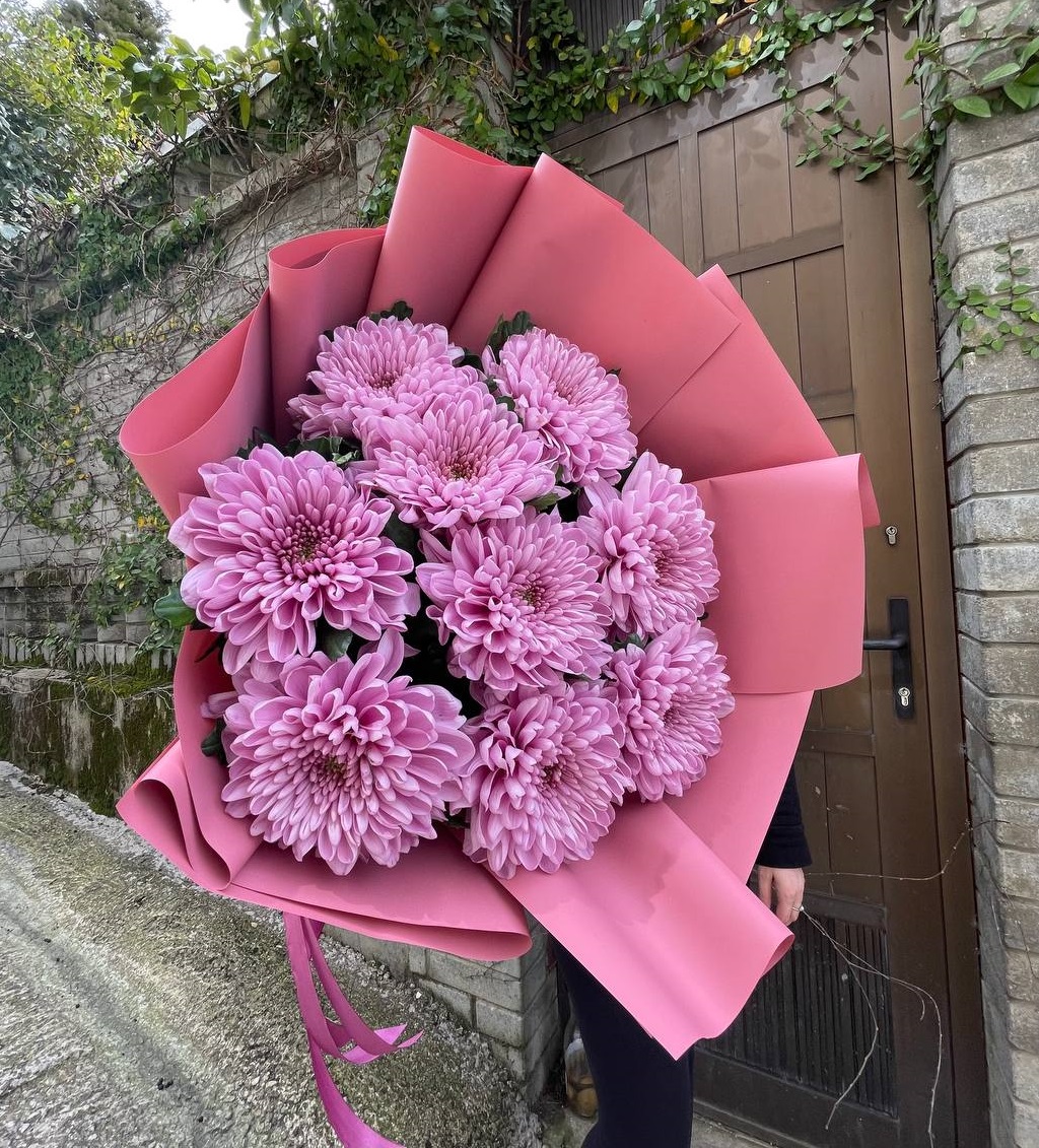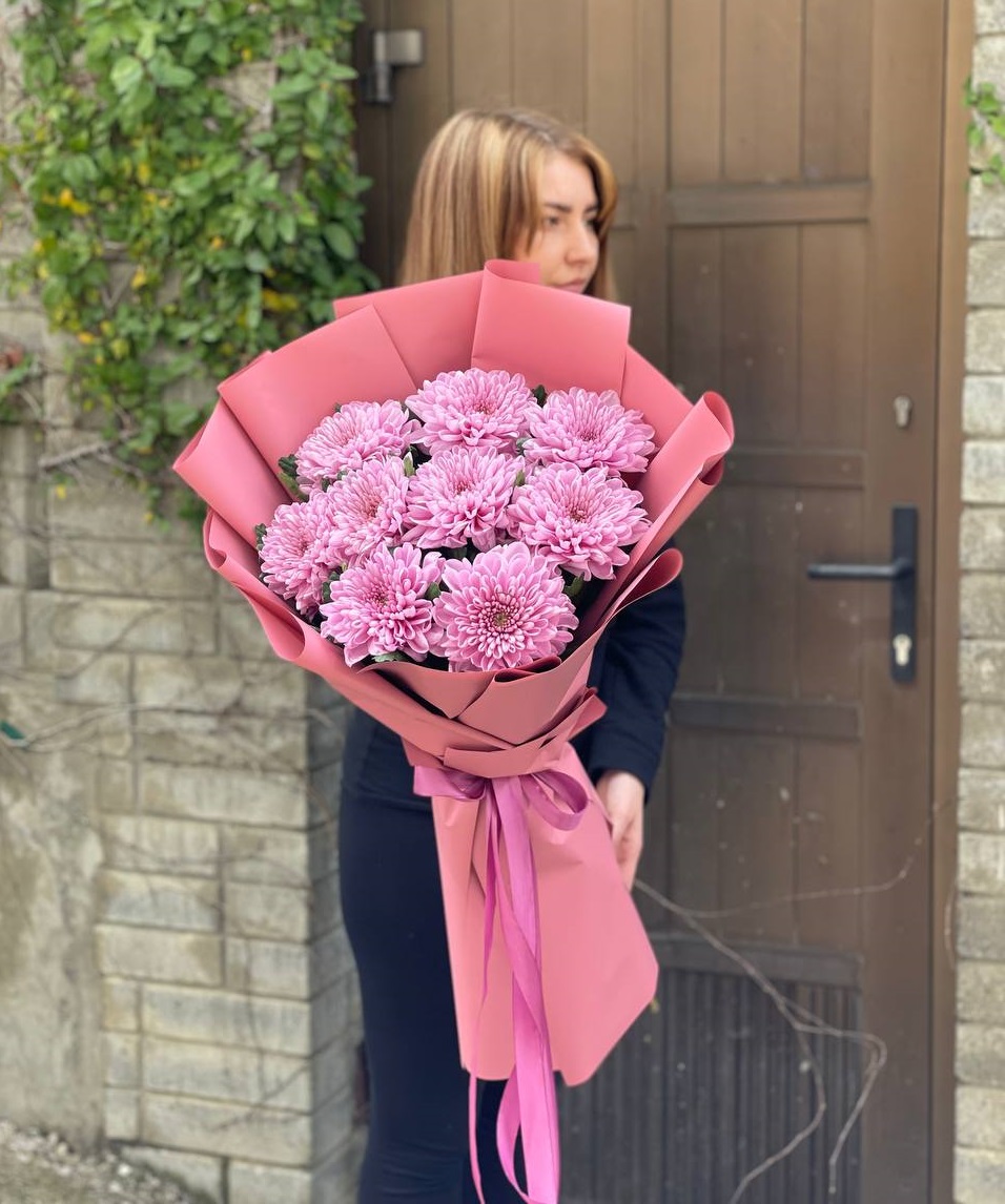 Девять крупных шаров фиолетовой хризантемы собраны в плотную округлую форму. Насыщенный оттенок создает глубину и объем, а упаковка подчёркивает графичность силуэта.