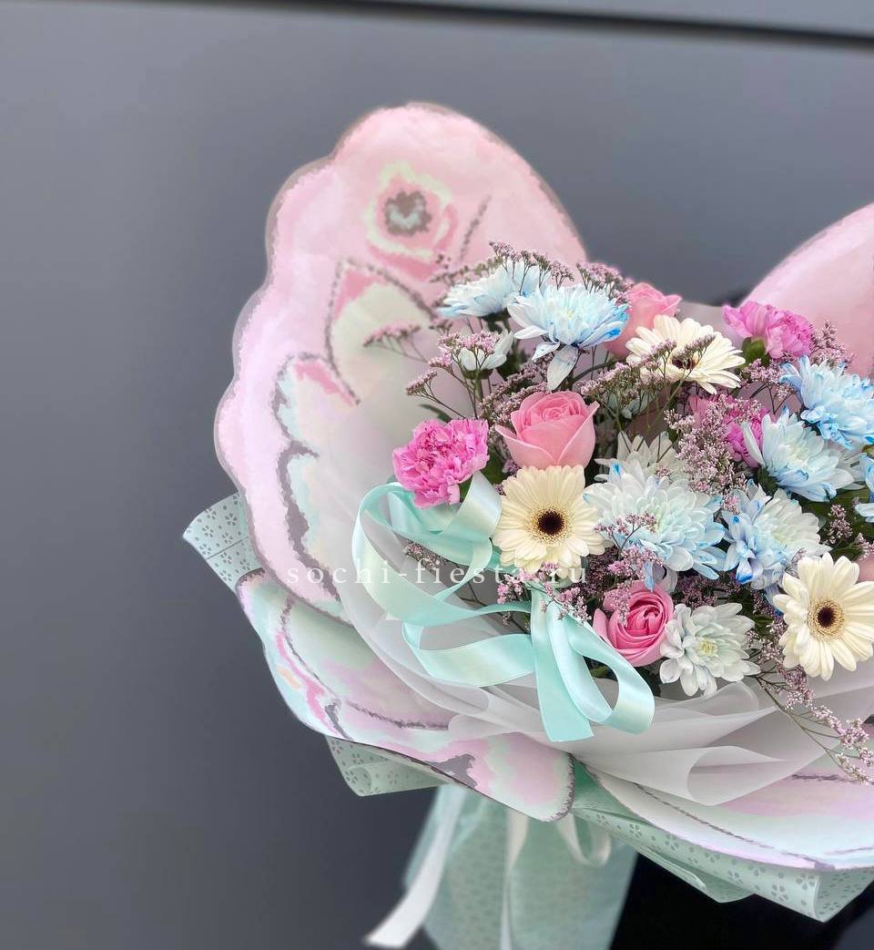 голубая хризантема, розовые розы, герберы, диантусы, лимониум, лента и дизайнерская упаковка бабочка.
