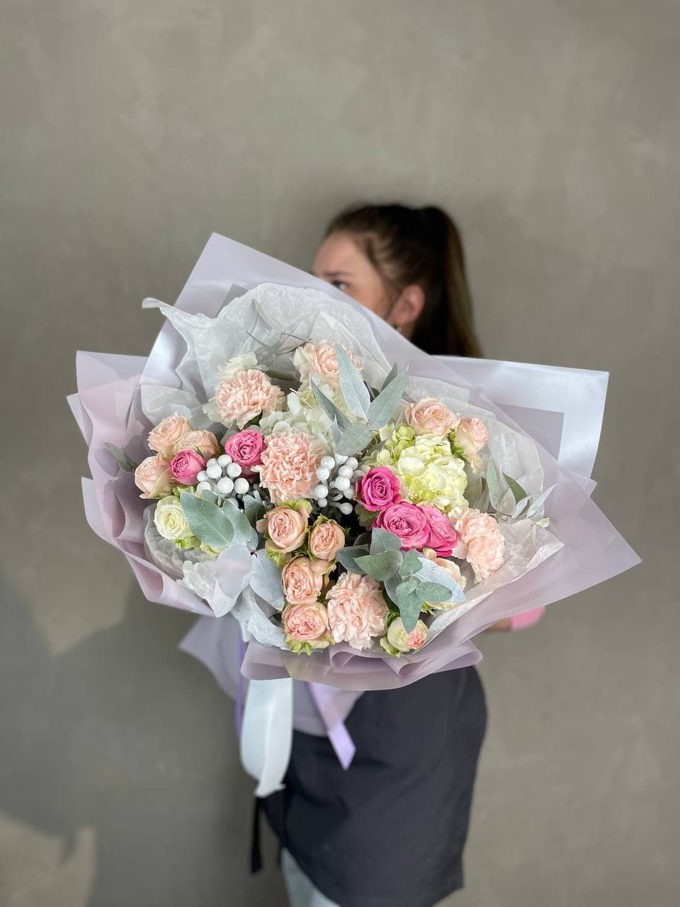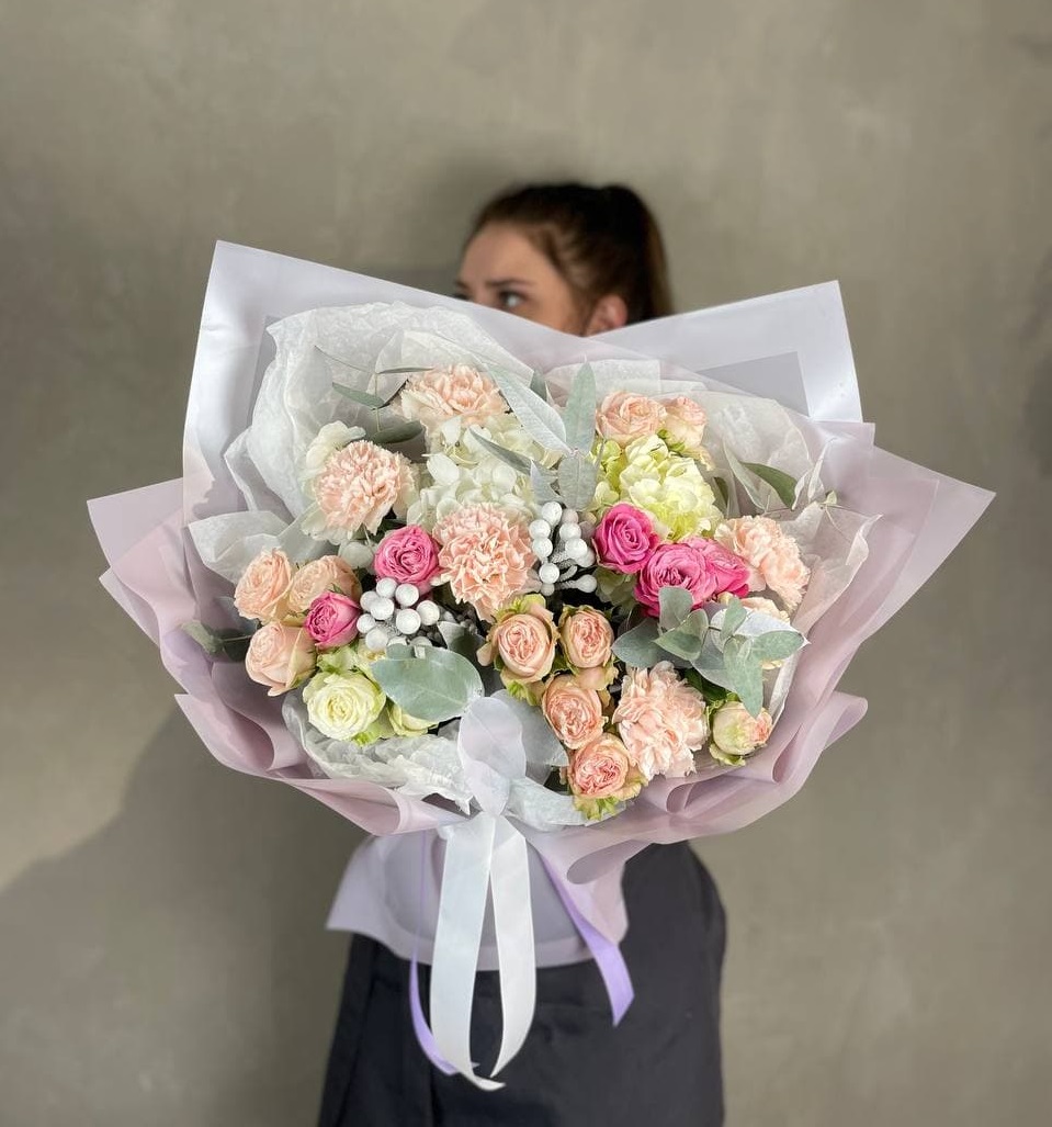 гортензия, диантус, кустовая пионовидная роза, эустома, орхидеи (или аналог), эвкалипт, лента, дизайнерская упаковка.