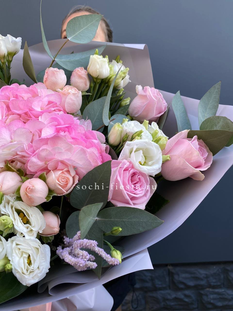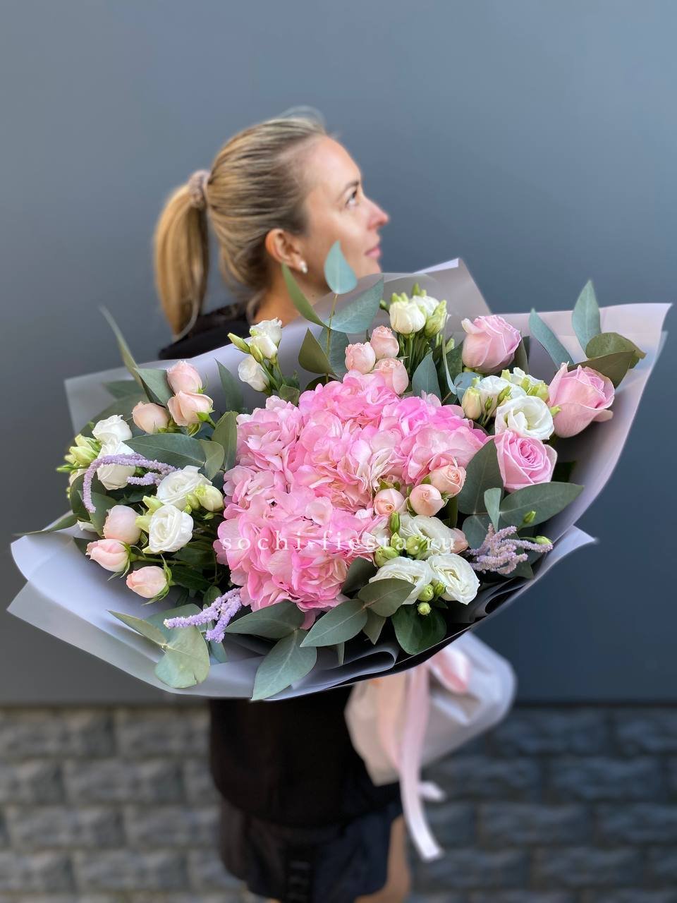 гортензия, розы одноголовые, дельфиниум (аналог вне сезона), ромашка, протея, маттиола (аналог вне сезона), лента, дизайнерская упаковка.