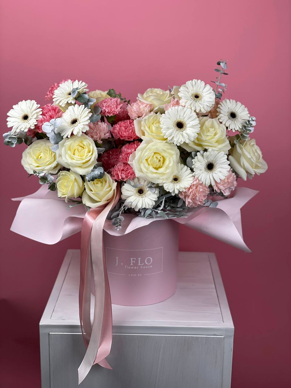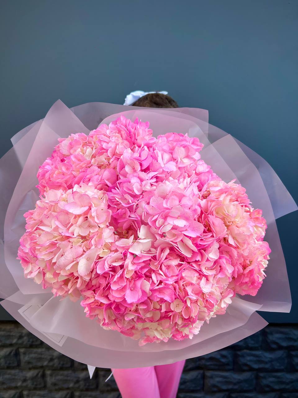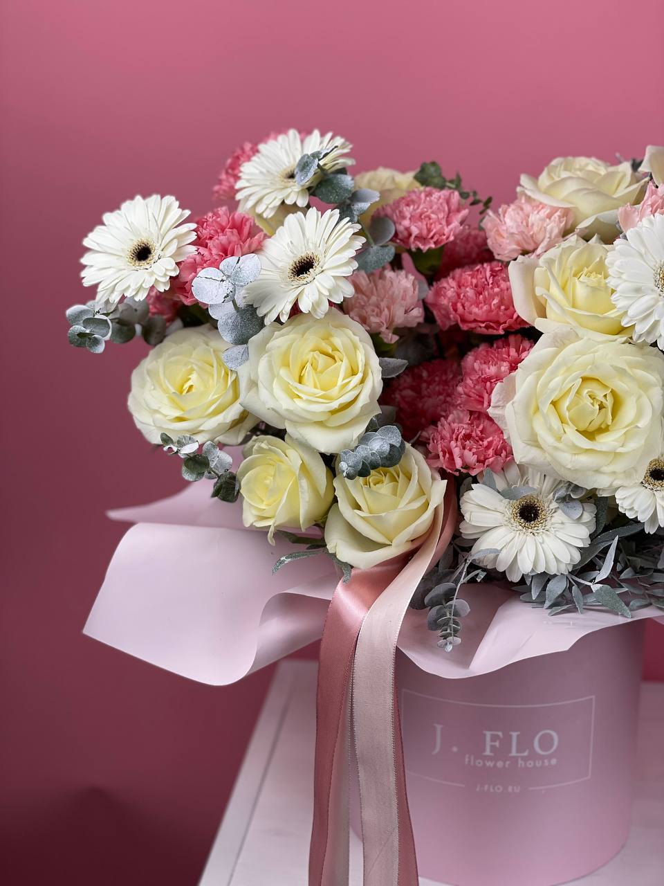 Пионовидные розы и крупные соцветия гортензии создают объёмную текстуру с мягкими переходами оттенков. Экзотическая гербера и диантус добавляют графичности, а воздушный аспарагус разбивает плотность композиции лёгкими штрихами.