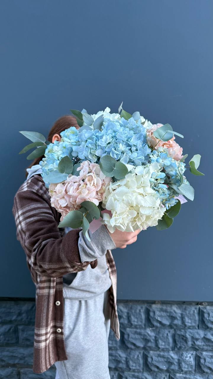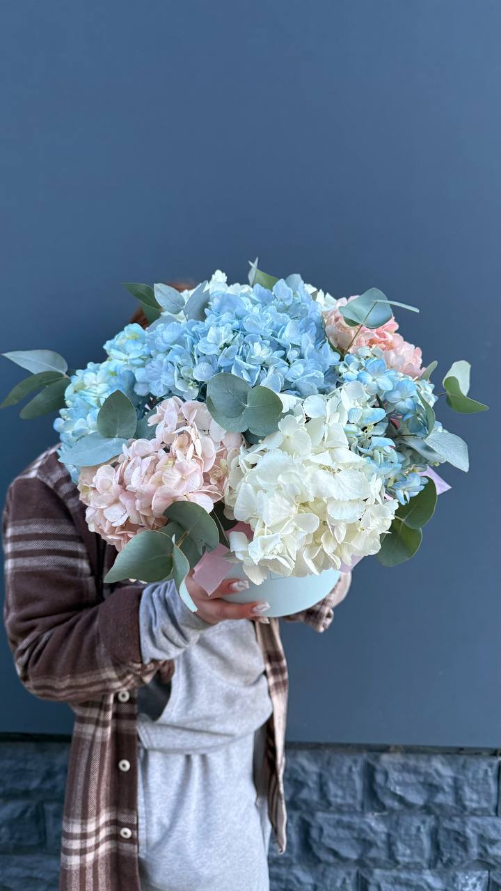 разноцветные гортензии с эвкалиптом в коробочке.