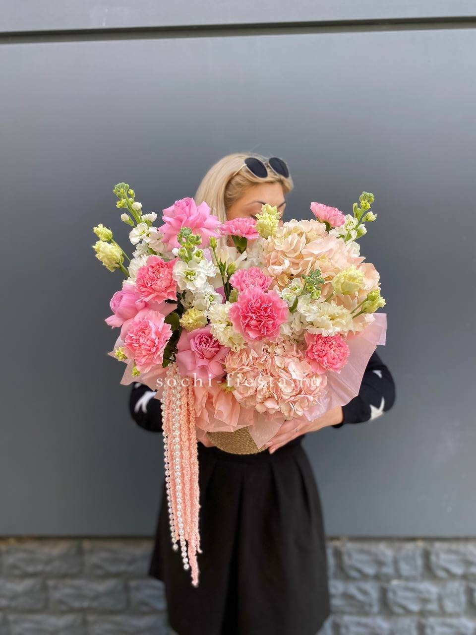 гортензия, диантус, розовые розы, маттиола, эустома, амарант, бусы (возможна замена), джутовое кашпо.