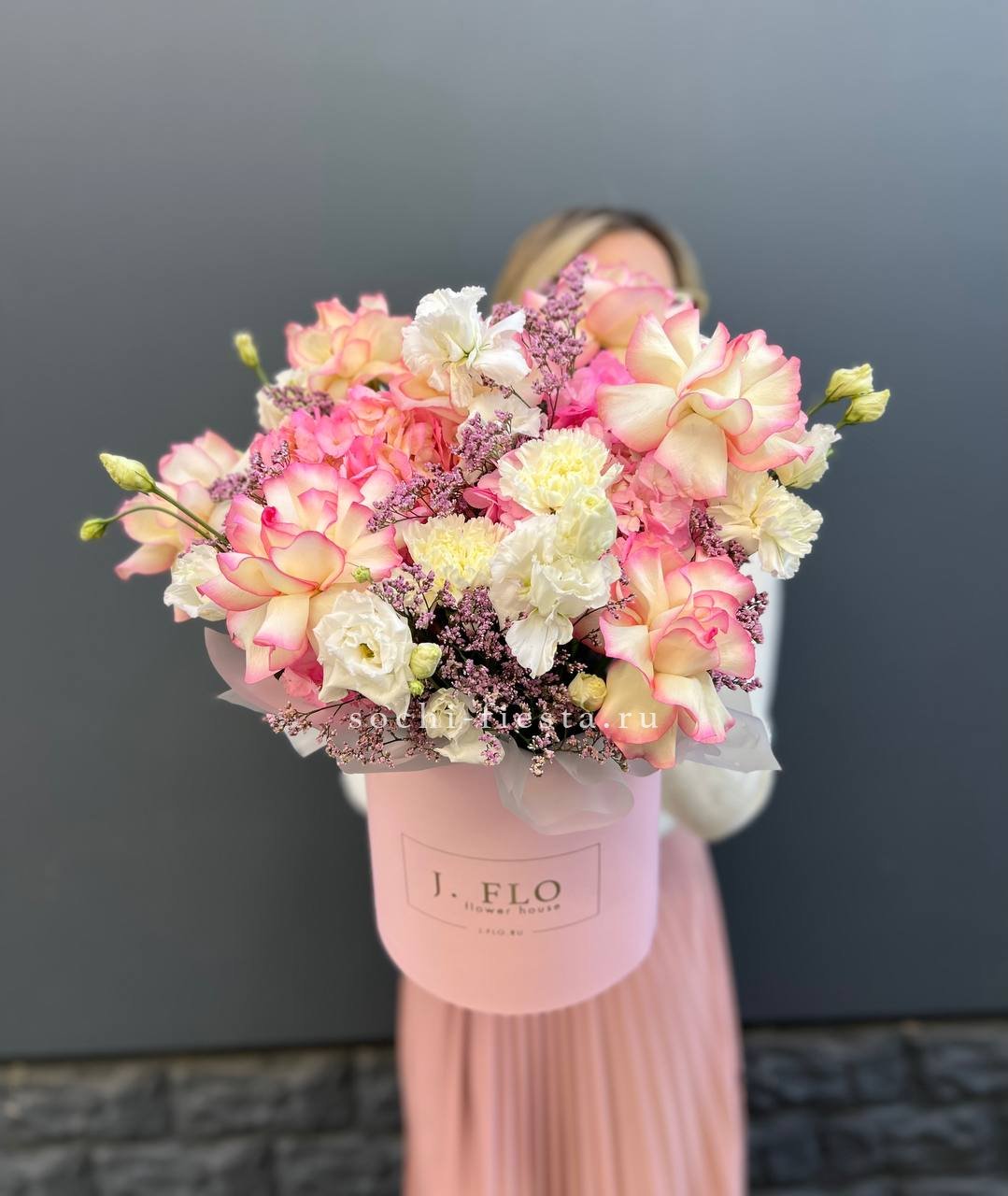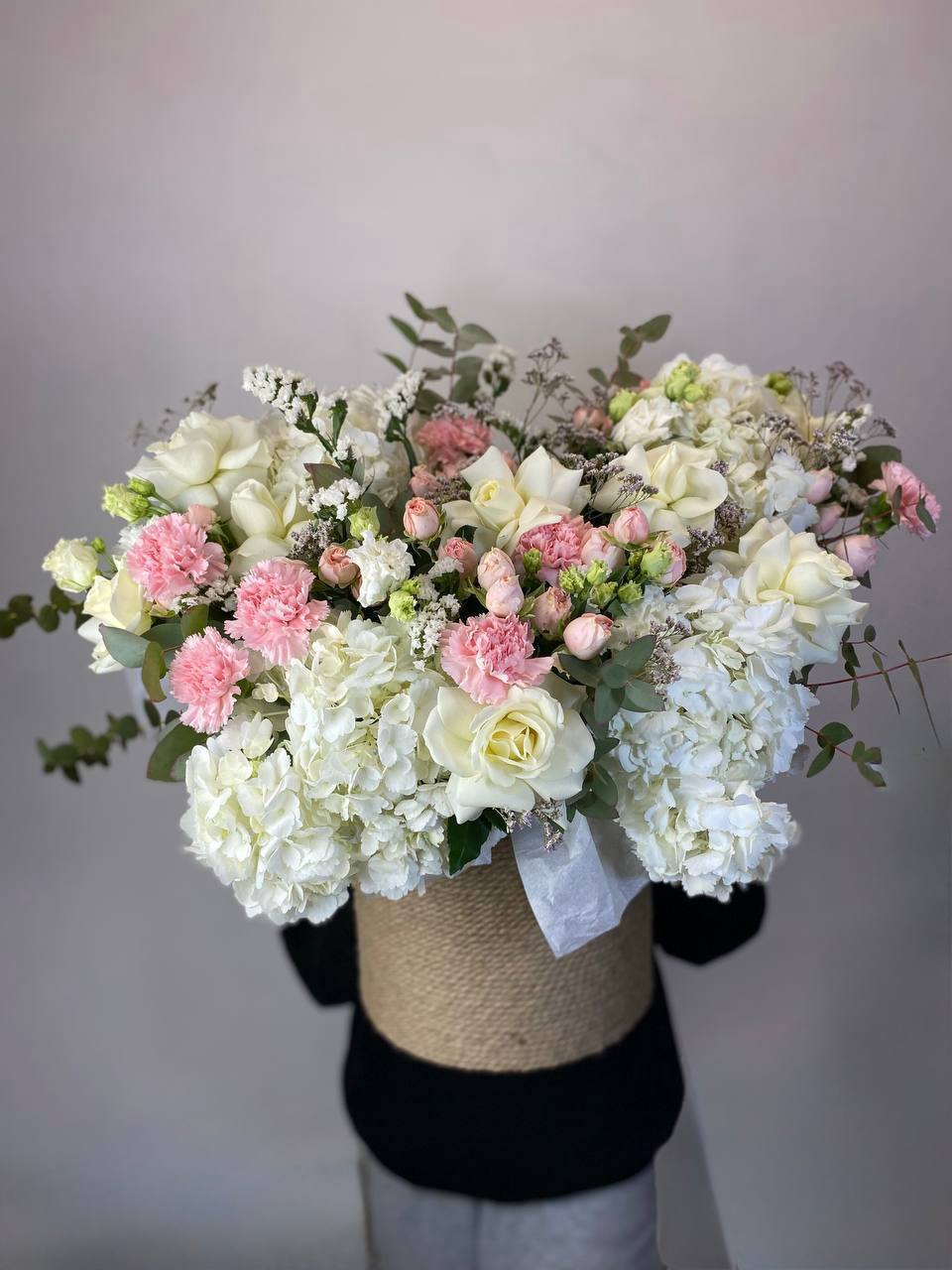 Компактная композиция в круглой коробке собрана из пышных бутонов и воздушной зелени. Roses сочетаются с многолепестковой эустомой и яркими диантусами, создавая объёмную текстуру. Подойдёт для небольших пространств и камерных поводов.