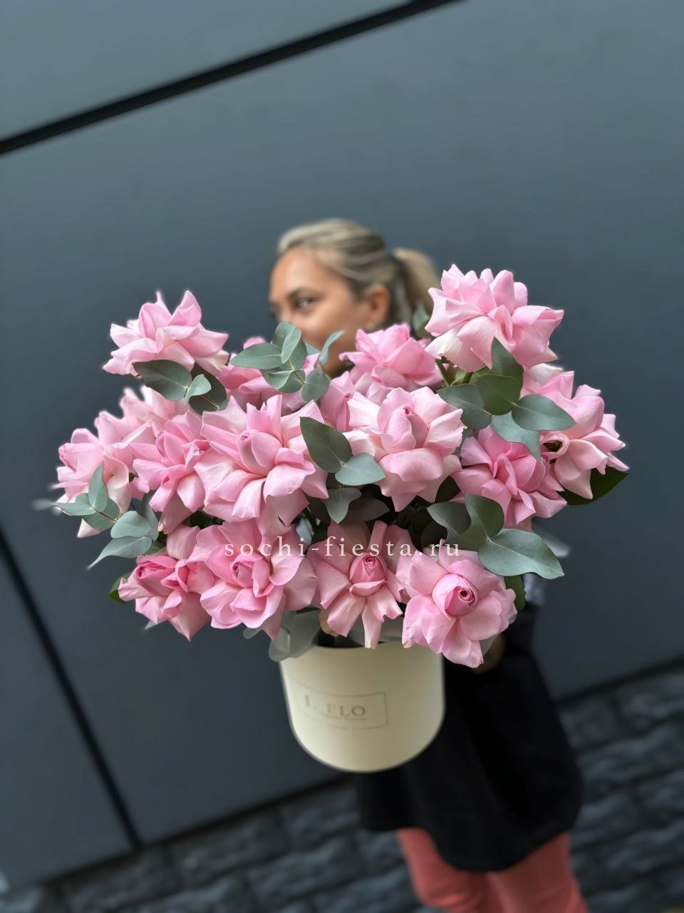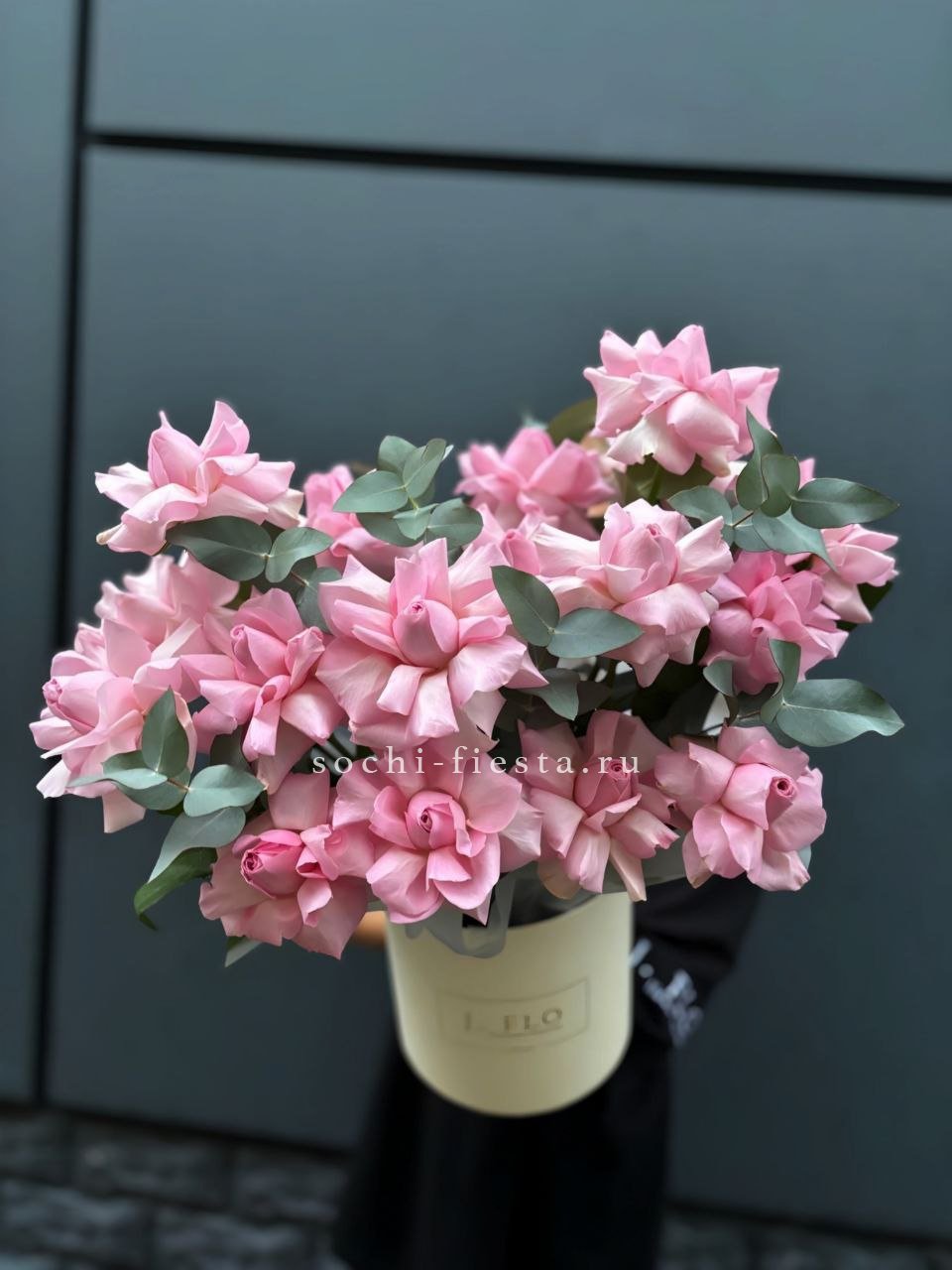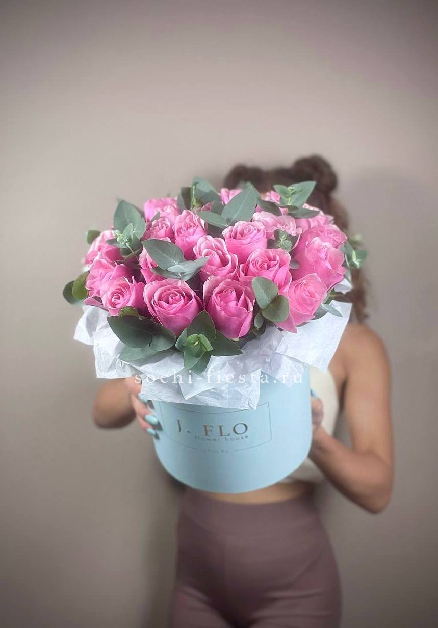 27 розовых роз в шляпной коробке с эвкалиптом.
