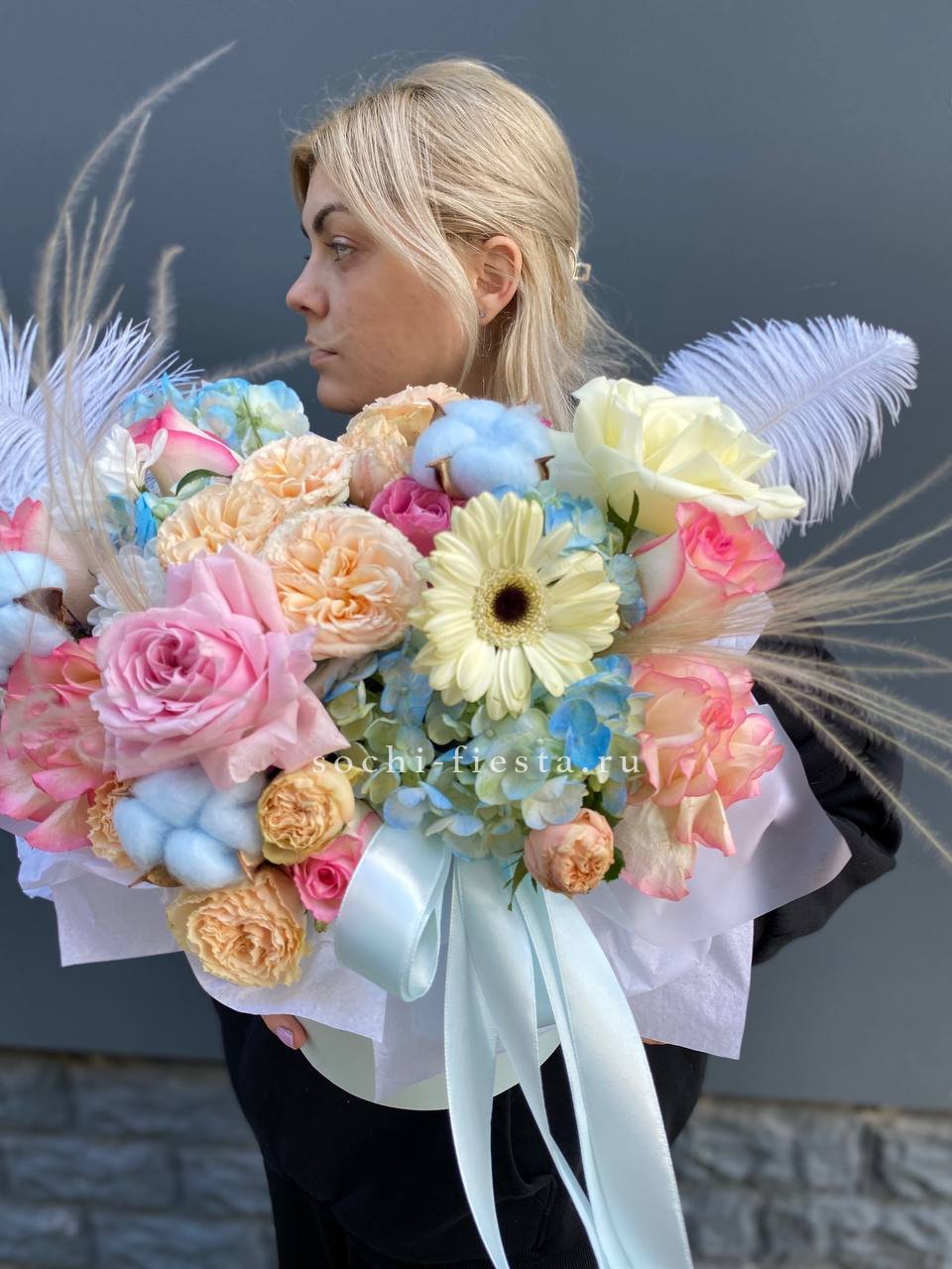 бокс из нежных розово-голубых цветов, розы, герберы, гортензии.