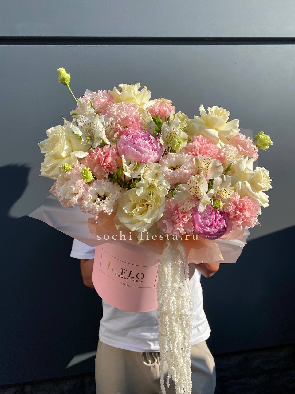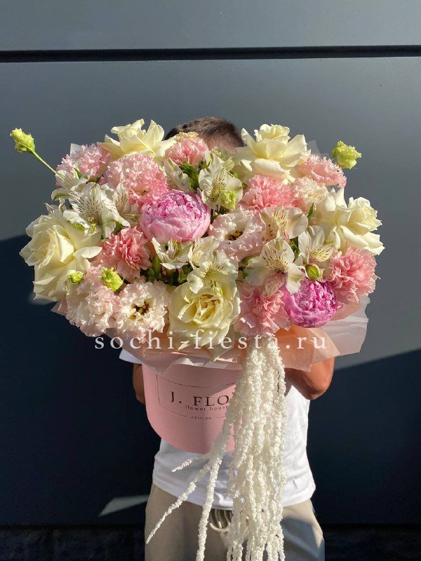 Цилиндр собран из пионов, роз и эустомы с добавлением диантусов и альстромерии. Амарант и эвкалипт создают объёмную текстуру. Композиция выразительна и хорошо держит форму.