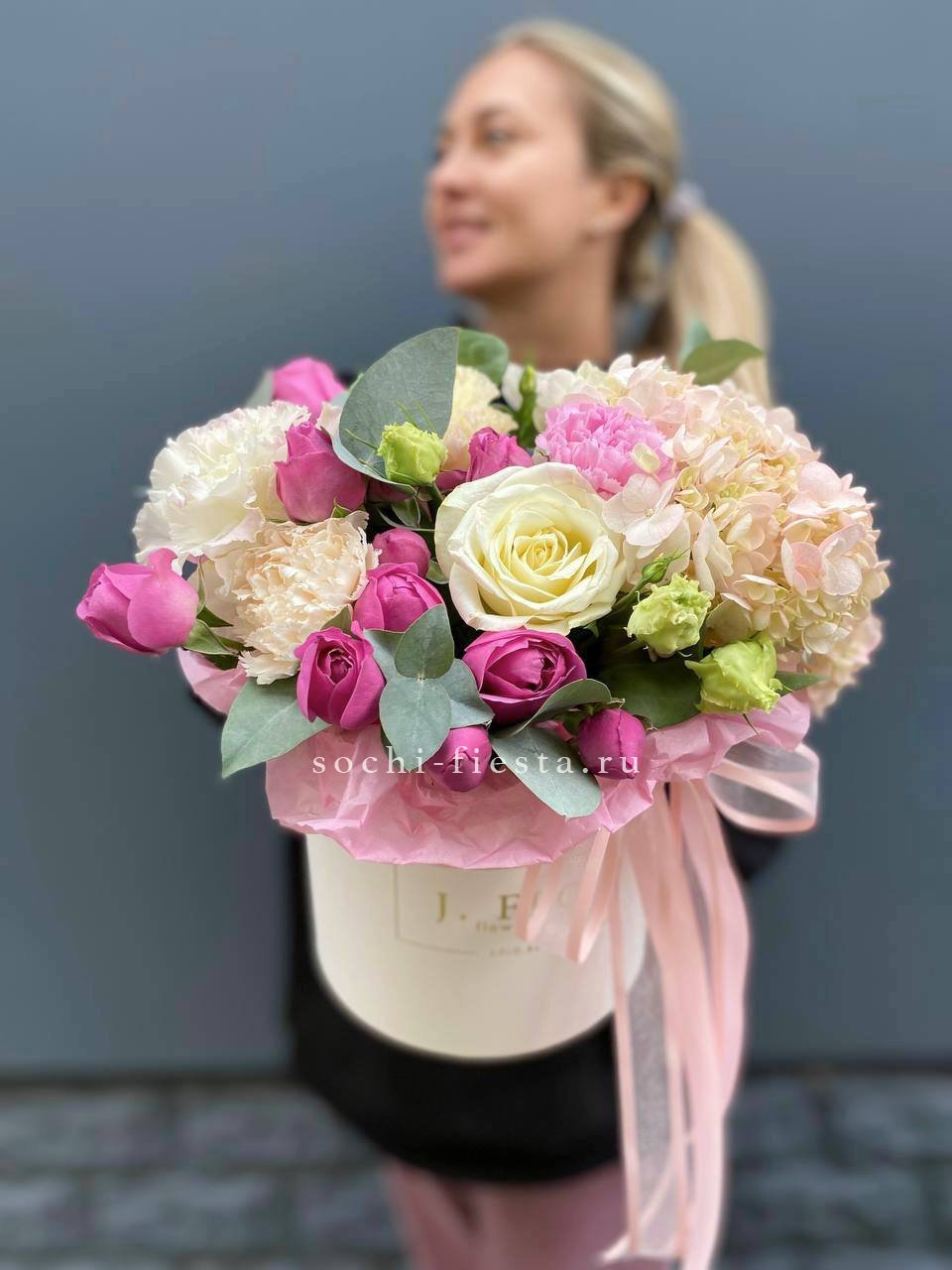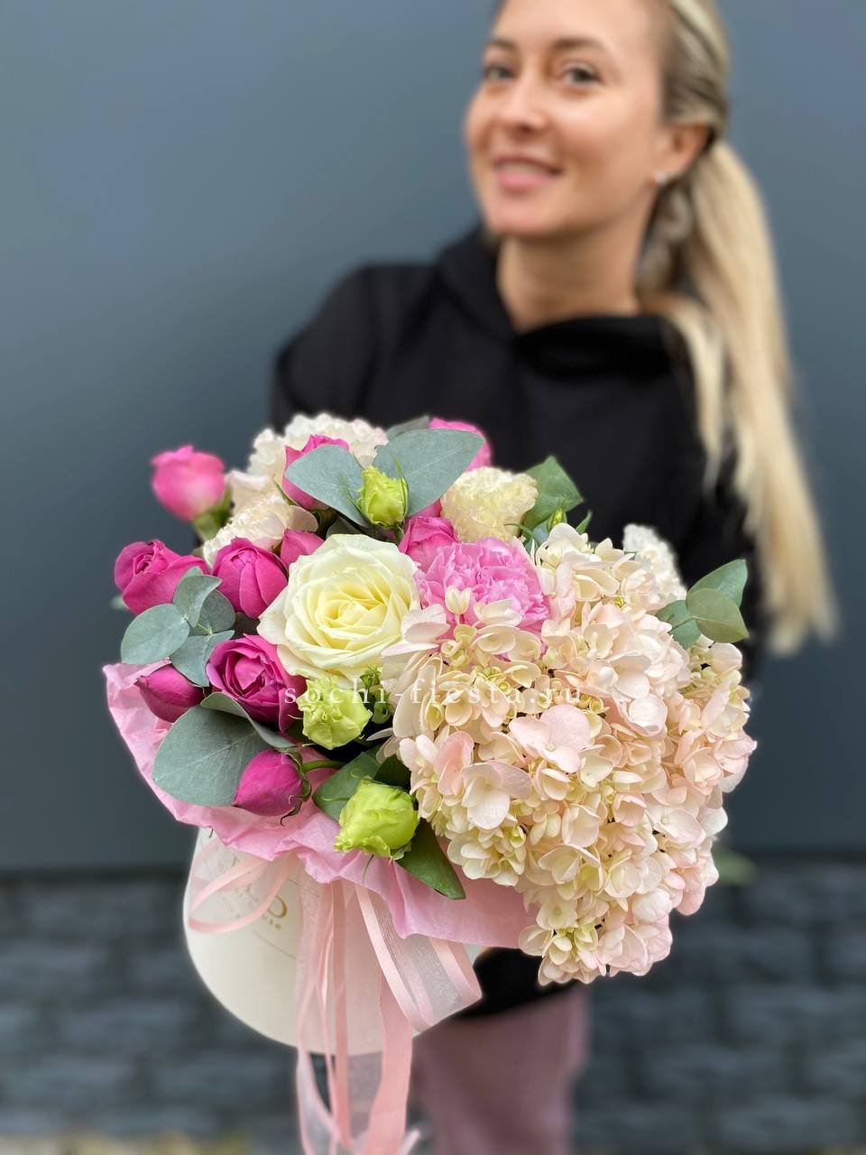 гортензия, кустовые розы, диантус, мисти баблс, эвкалипт, лента, цилиндр D16.
