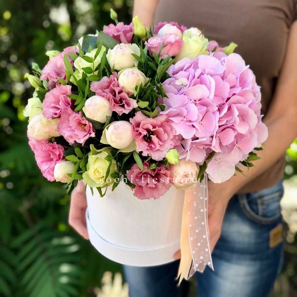 Розовая палитра переходит от французских роз к кустовым Джульетта с добавлением хлопка. Композиция в цилиндре сочетает воздушность и плотность фактур.