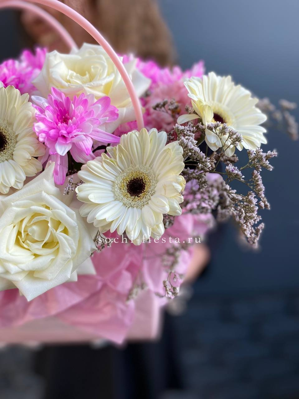 Герберы задают ритм композиции яркими пятнами среди белых роз и кустовой хризантемы. Лимониум заполняет объём воздушной текстурой. Сумка-кашпо удерживает форму и позволяет поставить букет без дополнительной вазы.