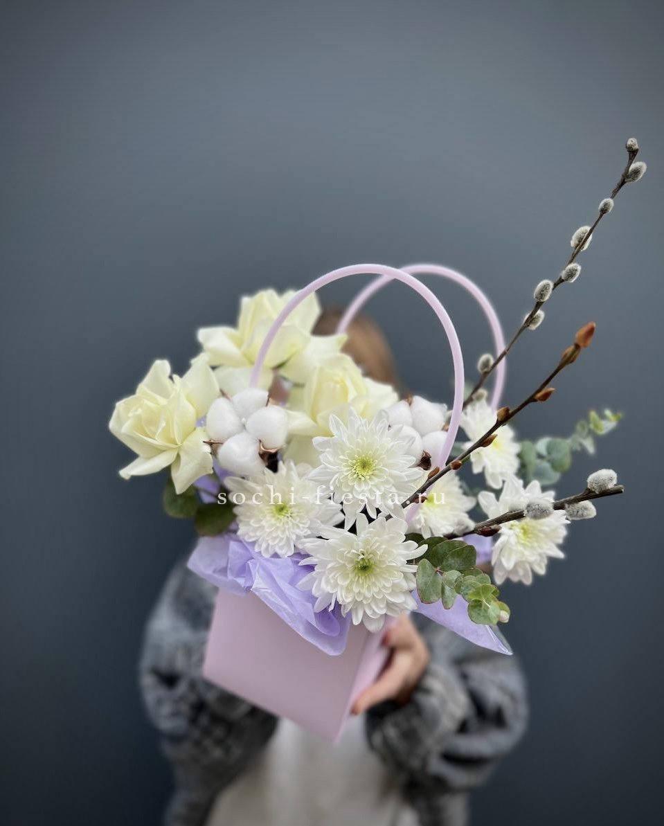 гербера, хризантема, диантус, статица, гортензия, сумочка.