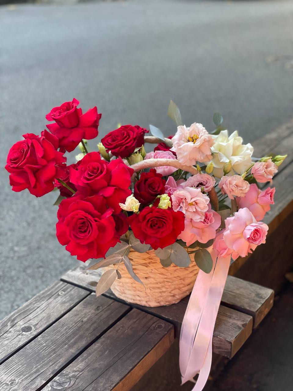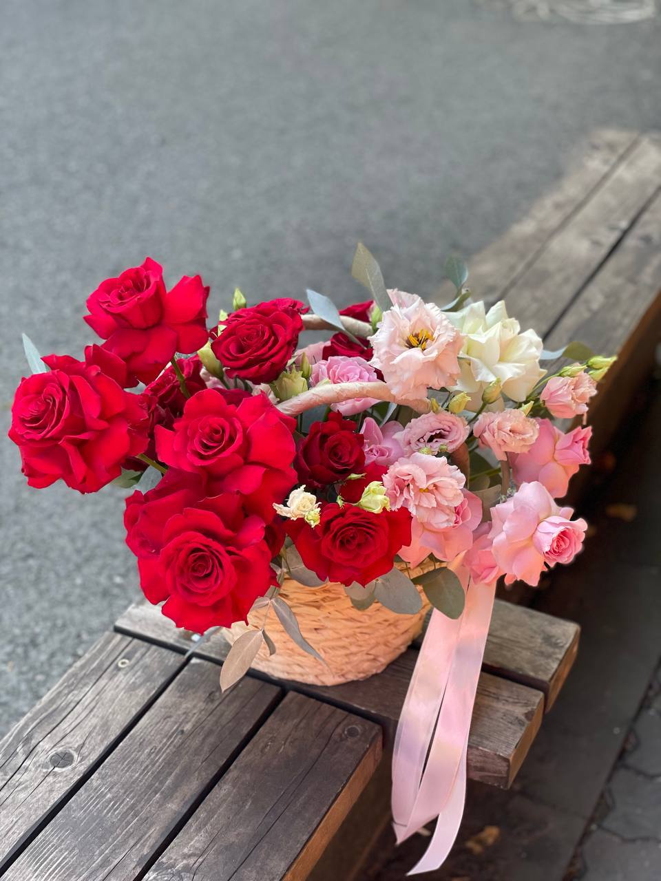 Корзина вмещает двести один бутон, образующих пышное цветочное полотно. Классическая форма подачи позволяет разместить композицию в любом пространстве без необходимости искать вазу. Впечатляющий объем для важных событий.