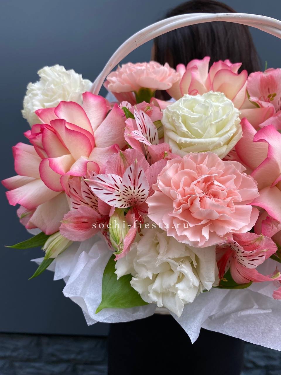 корзина выполнена в нежно-сиреневых тонах с применением декоративной зелени Состав: диантусы, эустома, эвкалипт, декоративная зелень,розы лента, светлая корзина.
