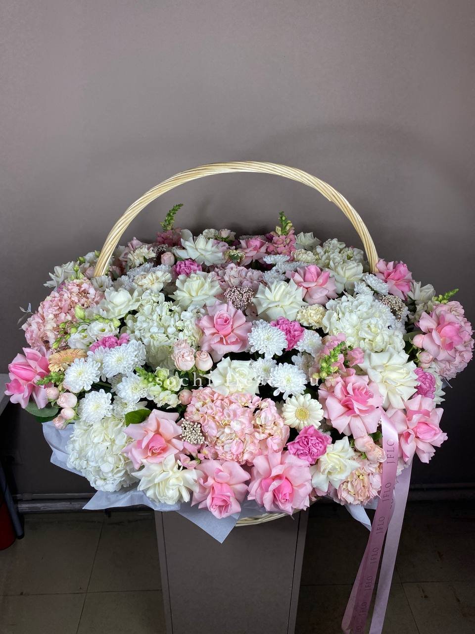 кустовые розы, одноголовые розы, диантусы,  гортензия, эустома, антиринум, озатамус, хризантема, герберы, лента, светлая корзина.Состав может меняться в зависимости от сезонности.