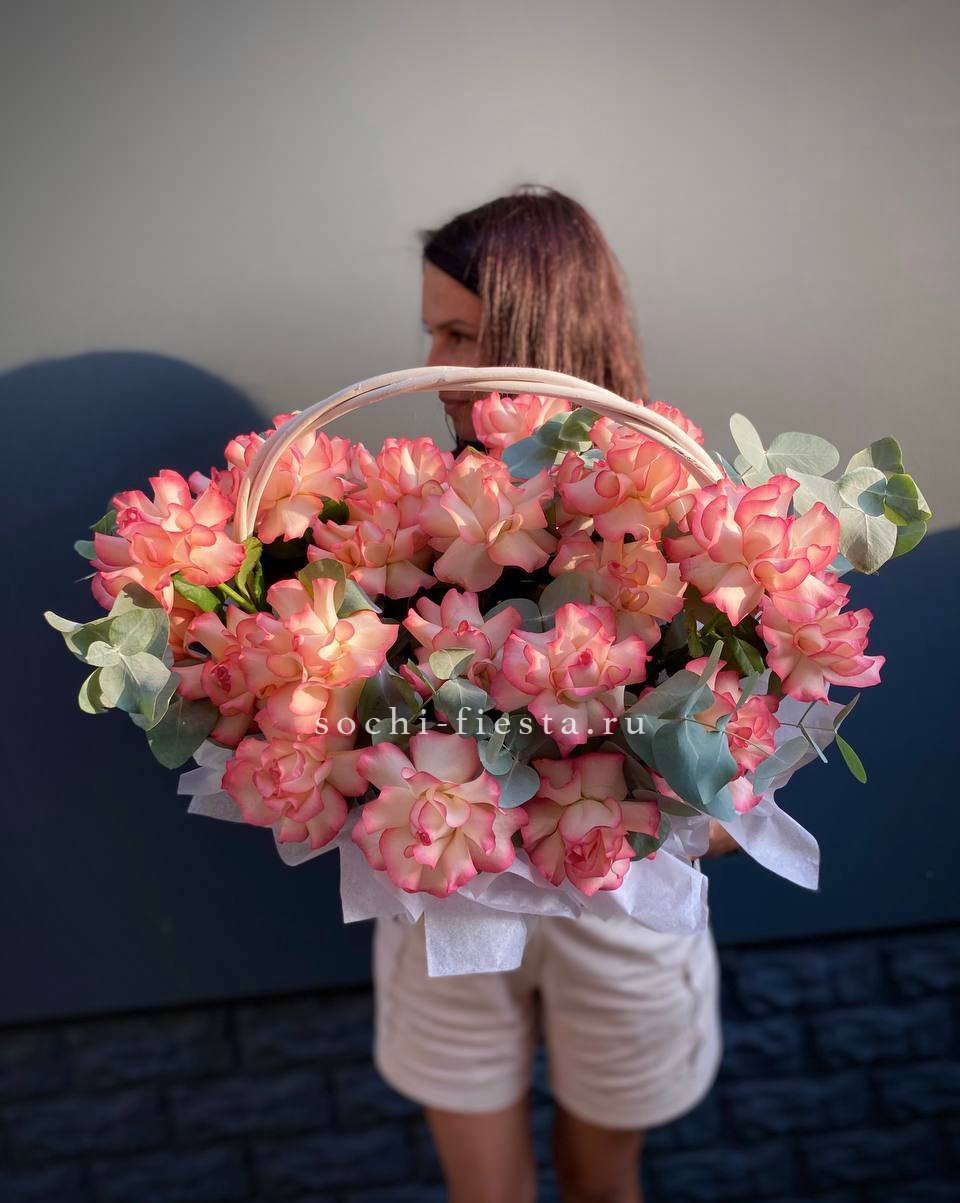 гортензия, эустома, пионовидная кустовая роза, розы одноголовые, диантусы, вспомогательная зелень, лента, корзина D45.