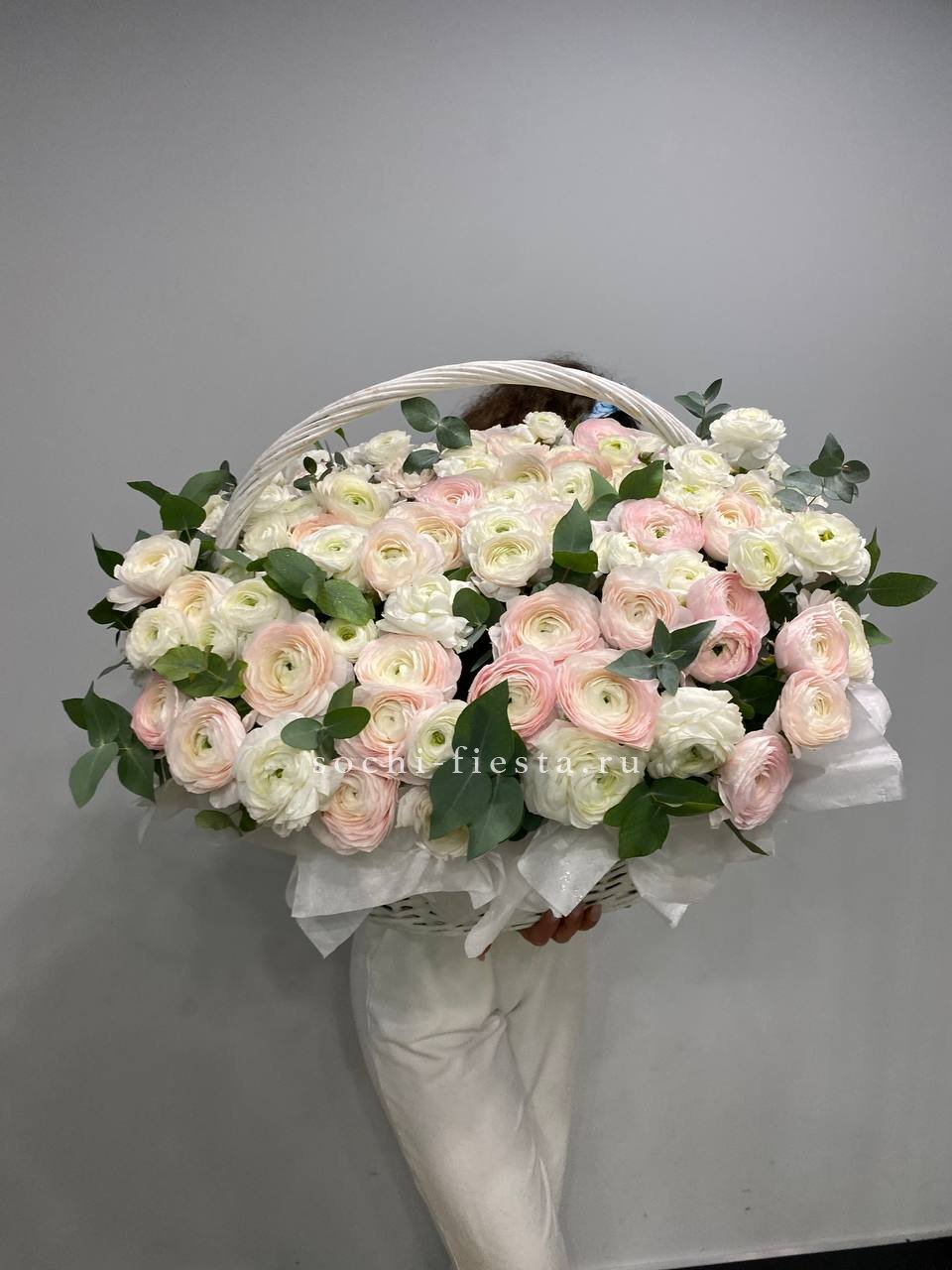 Плетёная корзина вмещает густую композицию из белых и розовых бутонов. Хризантемы и розы перемежаются с соцветиями гортензии, а статица добавляет воздушности между крупными головками цветов.