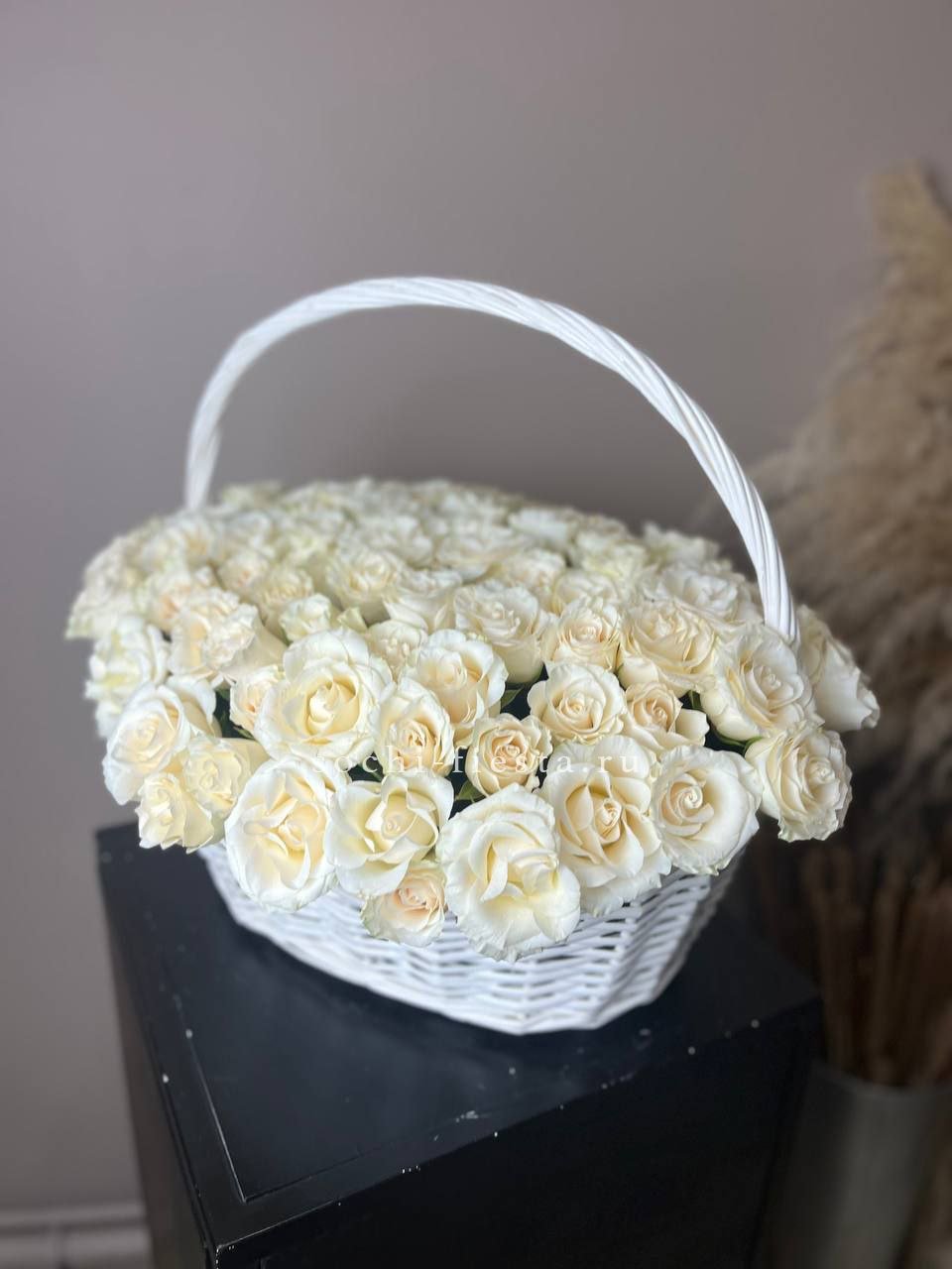 Белые розы и эустома образуют воздушную композицию с мягкими переходами между соцветиями. Хризантемы и маттиола добавляют объема, а гипсофила создает легкую дымку по краям. Корзина выглядит свежо и собранно в любом пространстве.