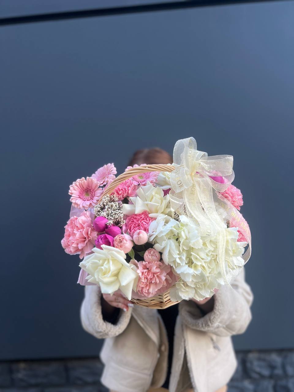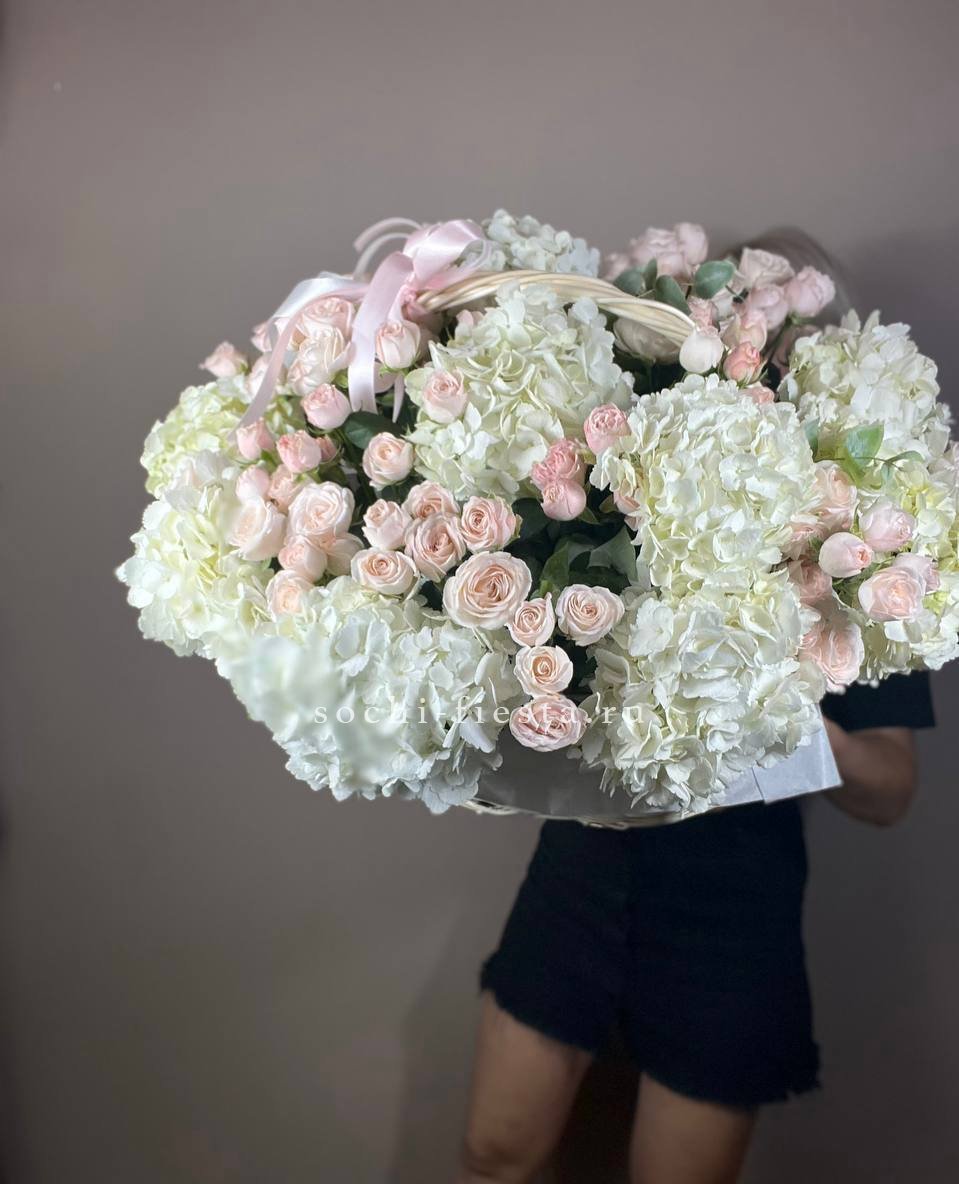Здесь идеально сочетаются крупные, бархатистые бутоны роз, облака гортензии и мелкие акцентные цветы. Получилась невероятно воздушная и легкая композиция, которая мгновенно создает ощущение праздника и весеннего настроения. Стильный бант завершает этот изысканный образ.