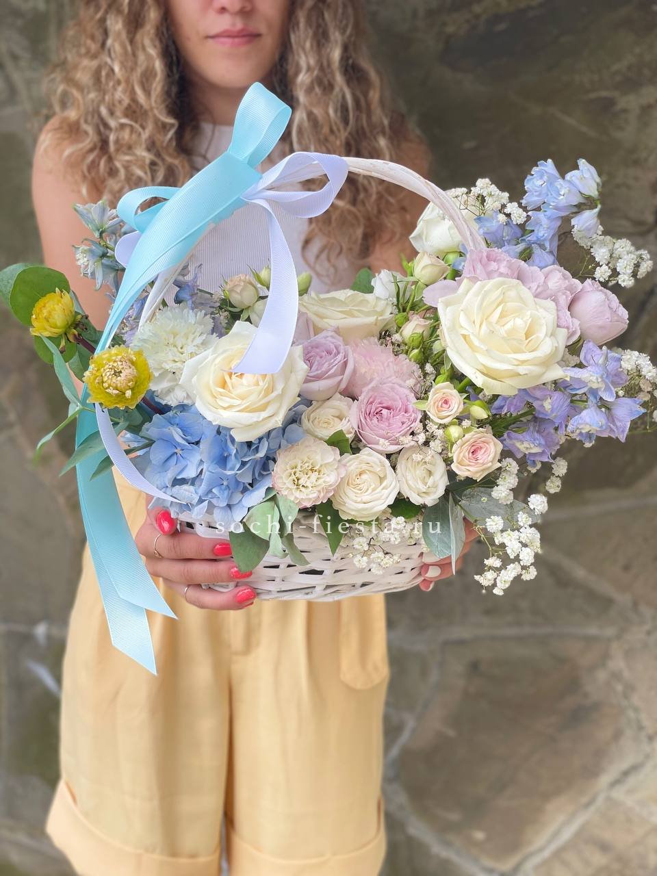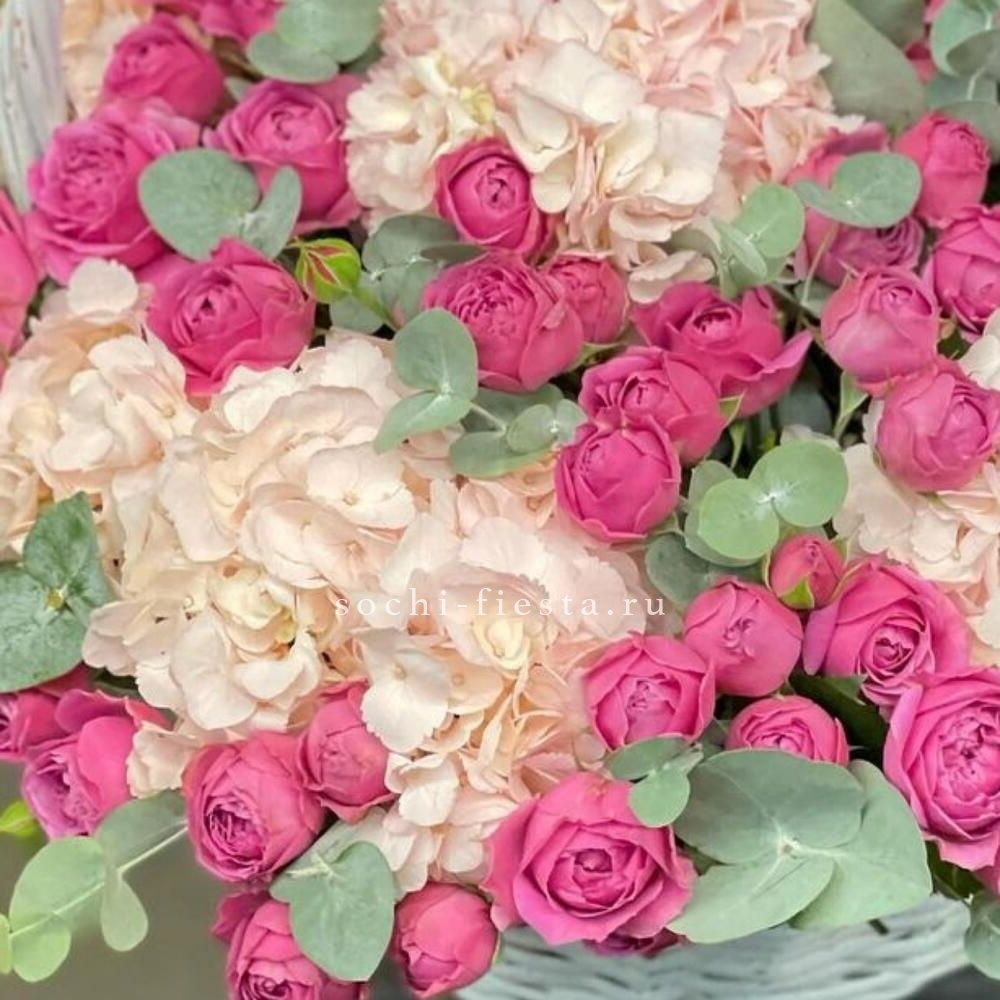 гортензии, мисти баблс, эвкалипт (круглолистый или остролистый в зависимости от сезона), лента, светлая корзина D40.