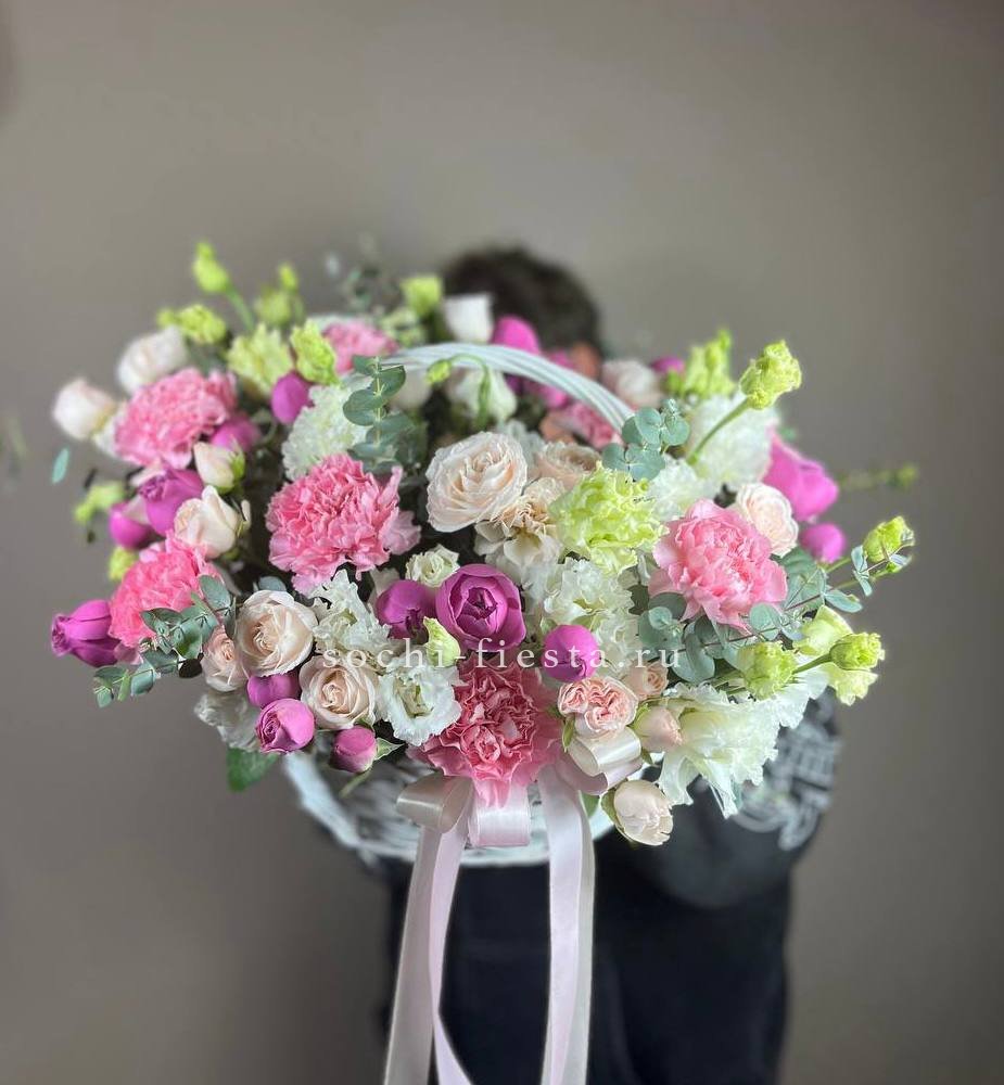 мисти баблс, бомбастик, эустома, диантус, эвкалипт, корзина маленькая.