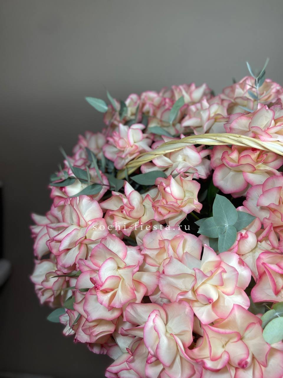 Плетеная корзина вмещает густую композицию из лилий с добавлением эвкалипта. Объемная форма создает впечатление цветущего сада, собранного в одном месте.