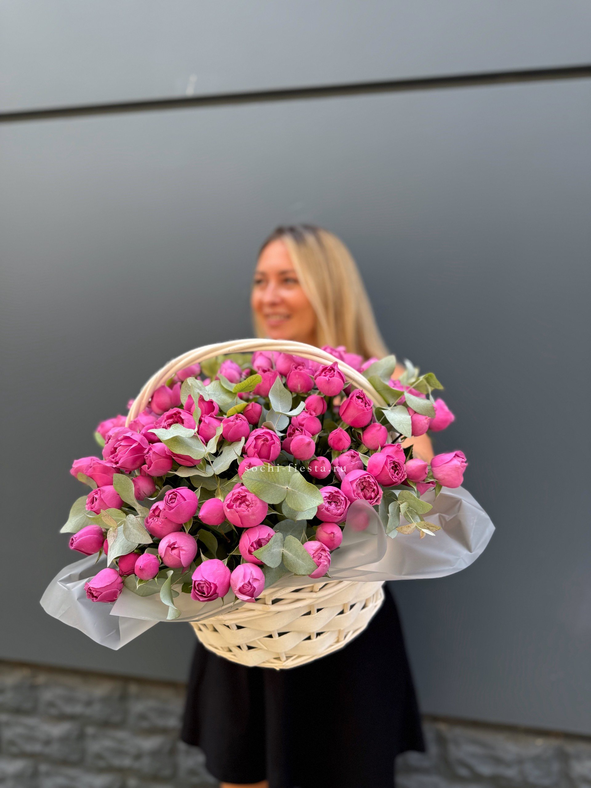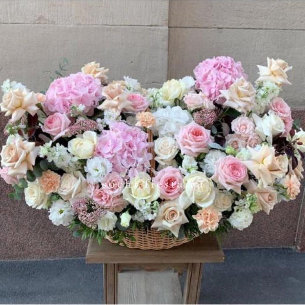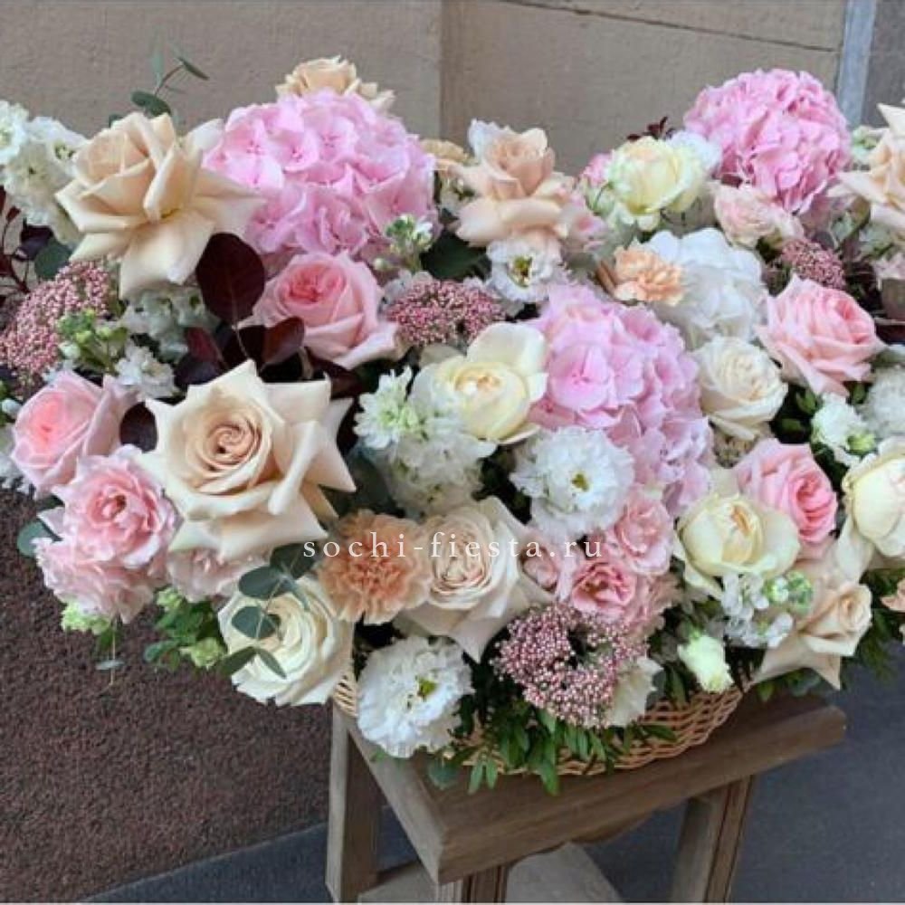 Монументальная композиция из полутора сотен белоснежных бутонов создает впечатление цветочного облака. Корзина придает устойчивость и завершенность форме, позволяя разместить такой масштабный ансамбль в любом пространстве.