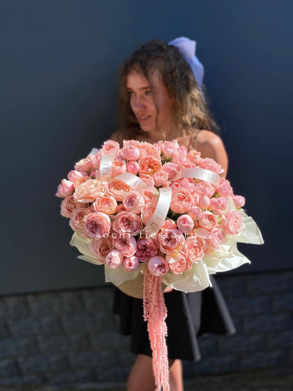 Пионовидные кустовые розы Джульетта с их густомахровыми бутонами создают объемную текстуру. Каждый цветок раскрывается слоями, формируя плотную и выразительную композицию в джутовом кашпо.