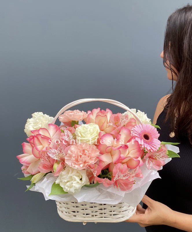розы нежных оттенков (по возможности джумилия),эустома, диантусы,  гербера, альстромерии,  лента, корзина
