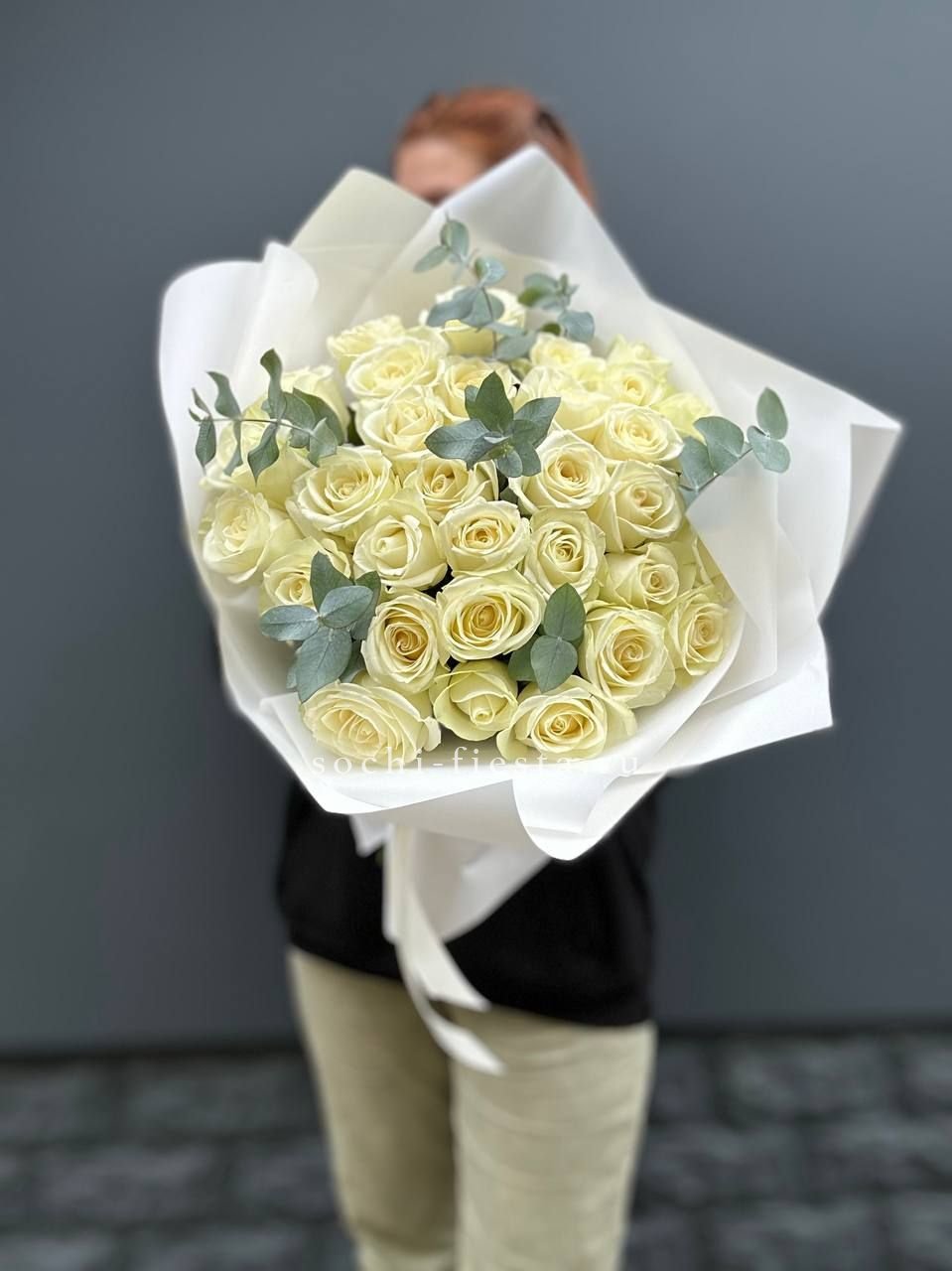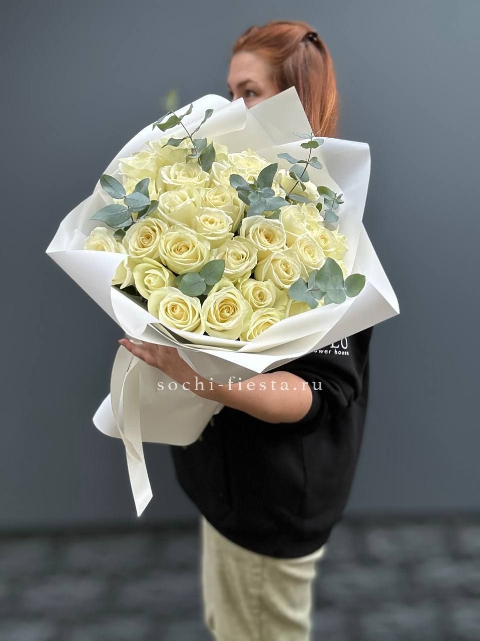 розы, диантусы, пионовидные кустовые розы, гортензия, эвкалипт, вспомогательная зелень, лента, дизайнерская упаковка.