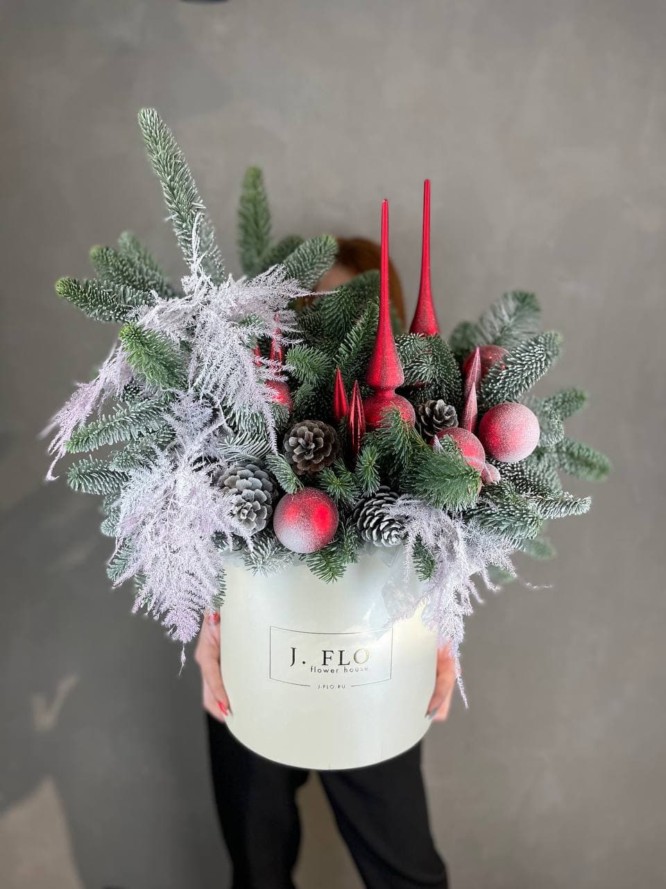 Живая ель нобилиса собрана в форму цилиндра с новогодними игрушками и шишками. Композиция держит форму благодаря оазису и устойчивому боксу. Яркий зимний акцент в интерьере.