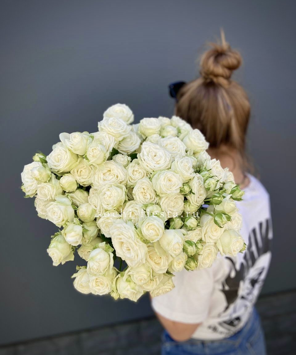 Белоснежные розы Бомбастик с густыми многолепестковыми бутонами собраны в свободную охапку. Каждый цветок раскрывается постепенно, создавая объёмную фактурную композицию.