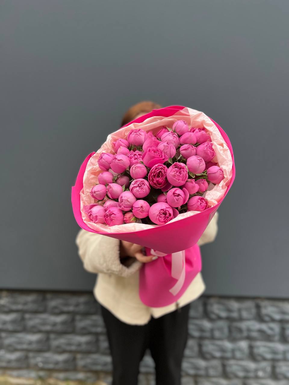 Семь пионовидных роз образуют компактный букет с мягкими линиями и спокойным ритмом. Ветви эвкалипта добавляют воздушности и завершают композицию.